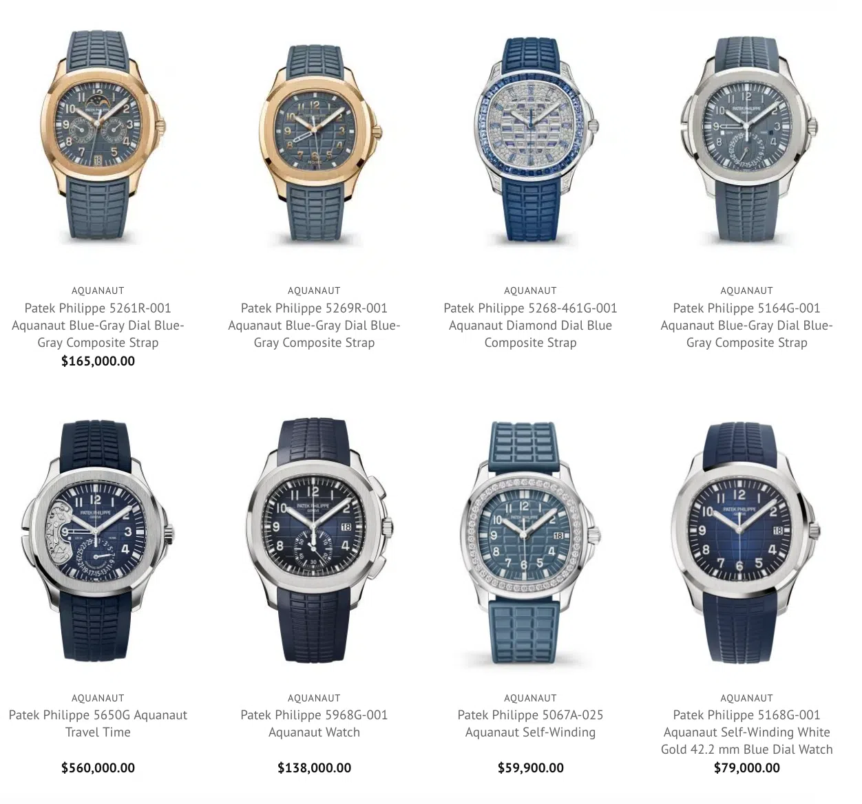 The cost of a Patek Philippe Blue Aquanaut in our collection goes from USD $560,000 to USD $59,900 depending on the condition of the timepiece.