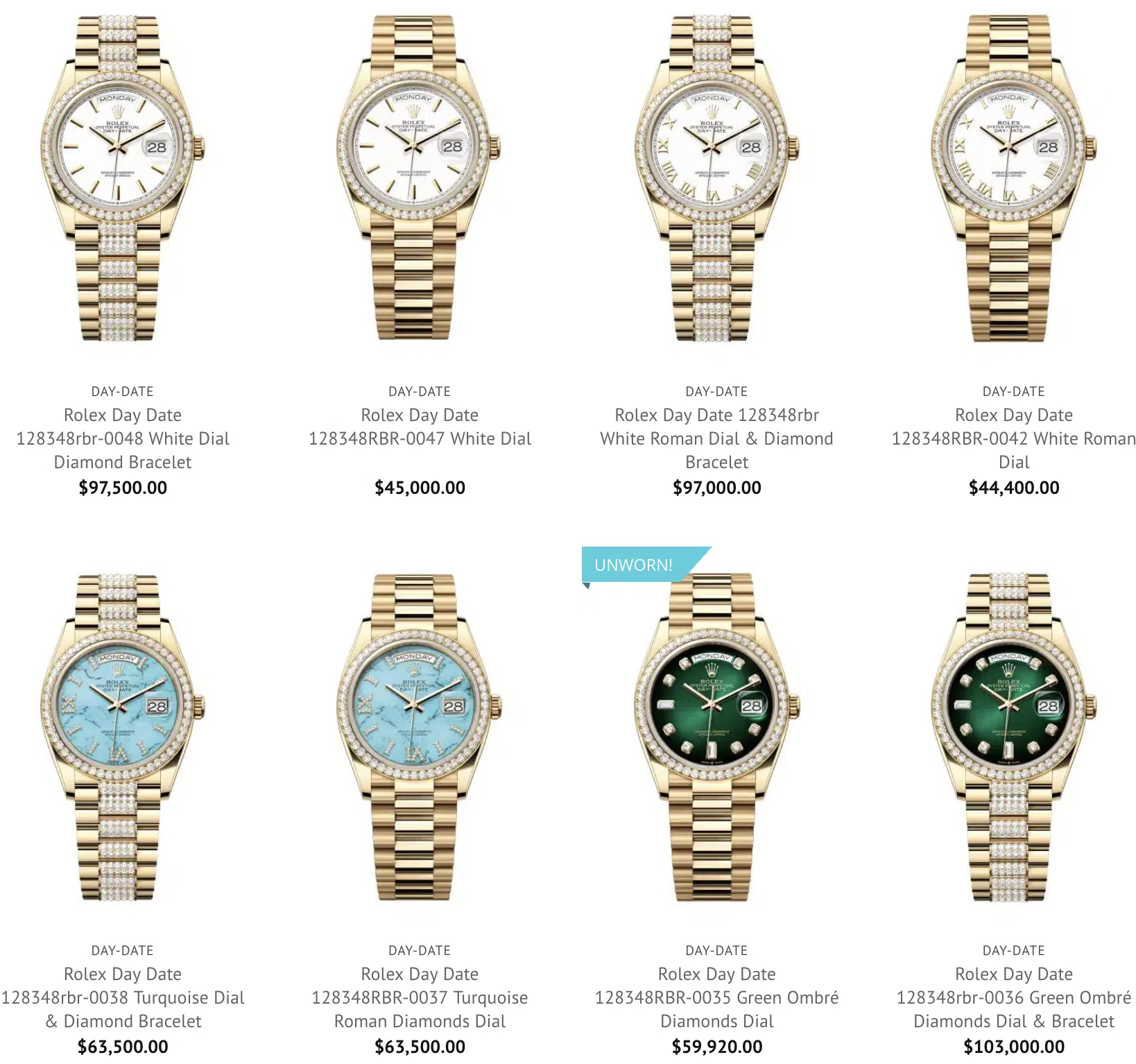 The cost of a Rolex 128348rbr Day Date in our collection goes from USD $44,400 to USD $130,000 depending on the condition of the timepiece.