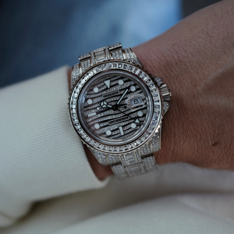 Rolex GMT-Master II “Ice” (Reference 116769TBR) stands as the crown jewel of his Rolex collection. This $485,350 masterpiece holds the distinction of being the most expensive Rolex ever offered to the public. Crafted entirely in 18k white gold, the watch features nearly 30 carats of diamonds covering every visible surface—79 round diamonds on the case and lugs, baguette-cut diamonds on the bezel, and a pavé diamond dial creating a mesmerizing wave pattern. The watch represents Rolex’s pinnacle achievement in gem-setting, with each stone factory-set by their in-house gemmologists.