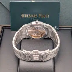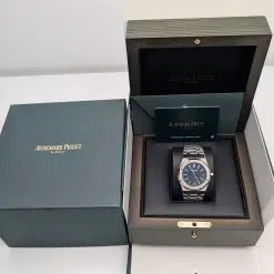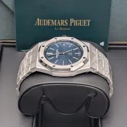 | Dial Material: | “Bleu nuit nuage 50” dial with “Petite Tapisserie” pattern, white gold applied hour-markers and Royal Oak hands with luminescent coating |