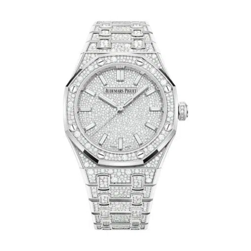 | Dial Material: | 18-carat white gold dial snow-set with brilliant-cut diamonds, baguette-cut diamond hour-markers, white gold Royal Oak hands with luminescent coating |