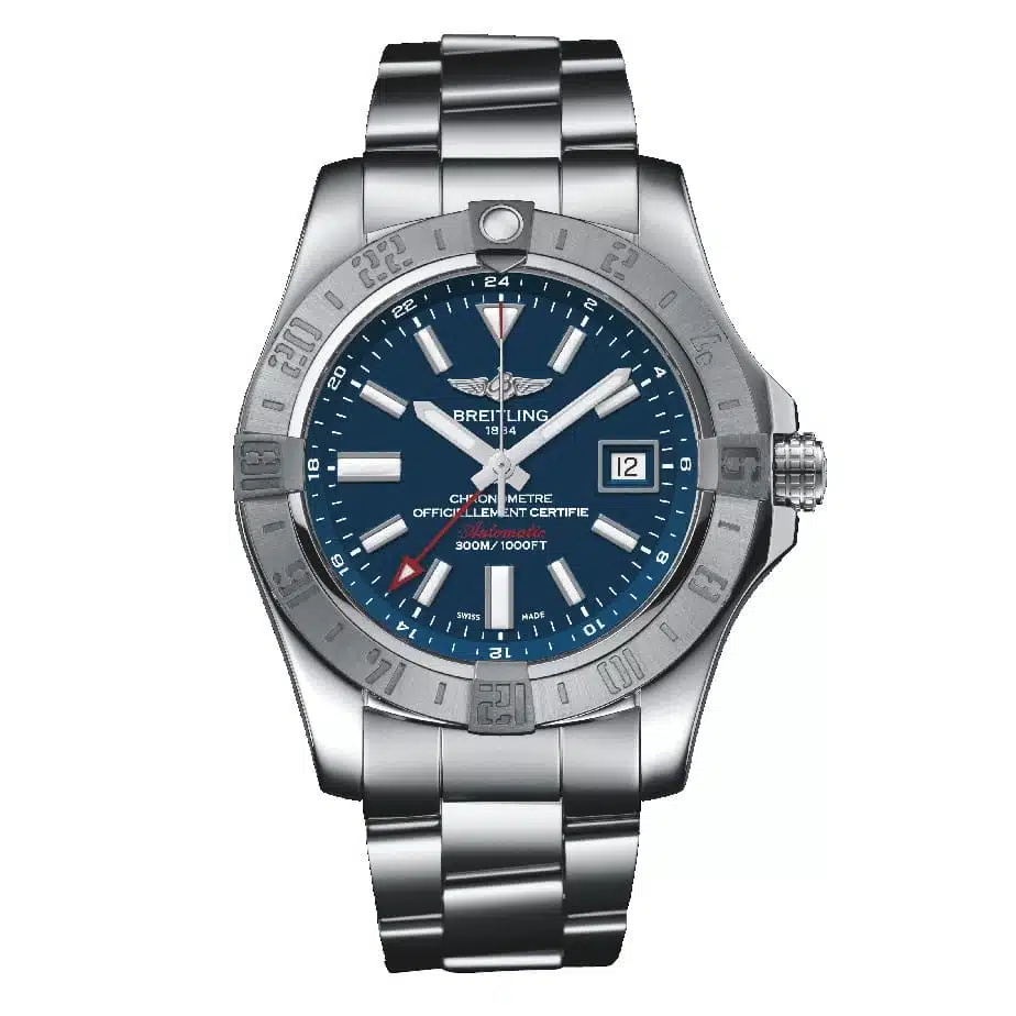 Breitling Avenger II GMT Watches. 43.00 mm stainless steel case, screw-locked crown, bidirectional ratcheted bezel, sapphire crystal with glareproof treatment on both sides, Mariner blue dial with index hour markers, selfwinding mechanical Breitling 32 movement with second time zone (24 hr) and date display, approximately 42 hours of power reserve, stainless steel Professional III bracelet. Water resistant to 300 m (1000 ft).