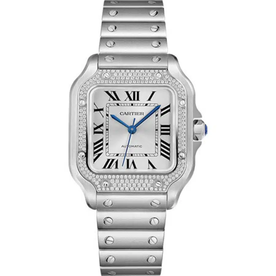 Experience Parisian elegance with the Cartier Santos W4SA0005, a 35mm stainless steel timepiece featuring a diamond-set bezel with 206 brilliant-cut diamonds totaling 0.64 carats. The silver sunray dial showcases iconic blue sword-shaped hands and Roman numeral markers, protected by scratch-resistant sapphire crystal. Powered by the reliable Cartier 1847 MC automatic movement, this 2024 model includes the innovative SmartLink adjustment system for perfect bracelet fit. Complete with original box and papers, plus an additional calfskin strap with deployant buckle, this luxury watch offers 100-meter water resistance and represents the perfect fusion of jewelry artistry and horological excellence.