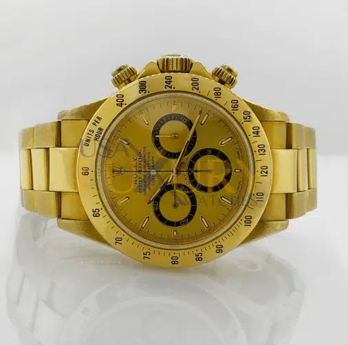 Rolex Oyster Perpetual Daytona 40 mm 18k Yellow Gold with fixed 18k Yellow Gold Bezel with Engraved Tachymetric Scale and Champagne Dial with golden Luminous Hands and luminous Hour Markers. Screw-Down 18k Yellow Gold Crown and two Screw-Down push-buttons, three Chronograph Sub-Dials with Arabic numerals. The watch has Oyster 18k Yellow Gold bracelet with Oyster Clasp. The Zenith automatic movement. Made in Switzerland.