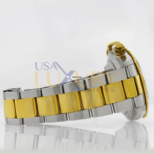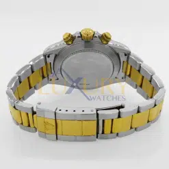 Rolex Oyster Perpetual Daytona 40 mm 18k Yellow Gold and Stainless Steel with fixed 18k Yellow Gold Bezel with Engraved Tachymetric Scale and Champagne Dial with Luminous Golden Hands and luminous Hour Markers. Screw-Down Crown and two Screw-Down push-buttons, three Chronograph Sub-Dials with Arabic numerals. The watch has Oyster 18k Yellow Gold and Stainless Steel bracelet with Oyster Clasp. The Zenith automatic movement with inverted “6” in middle sub-dial. Made in Switzerland.