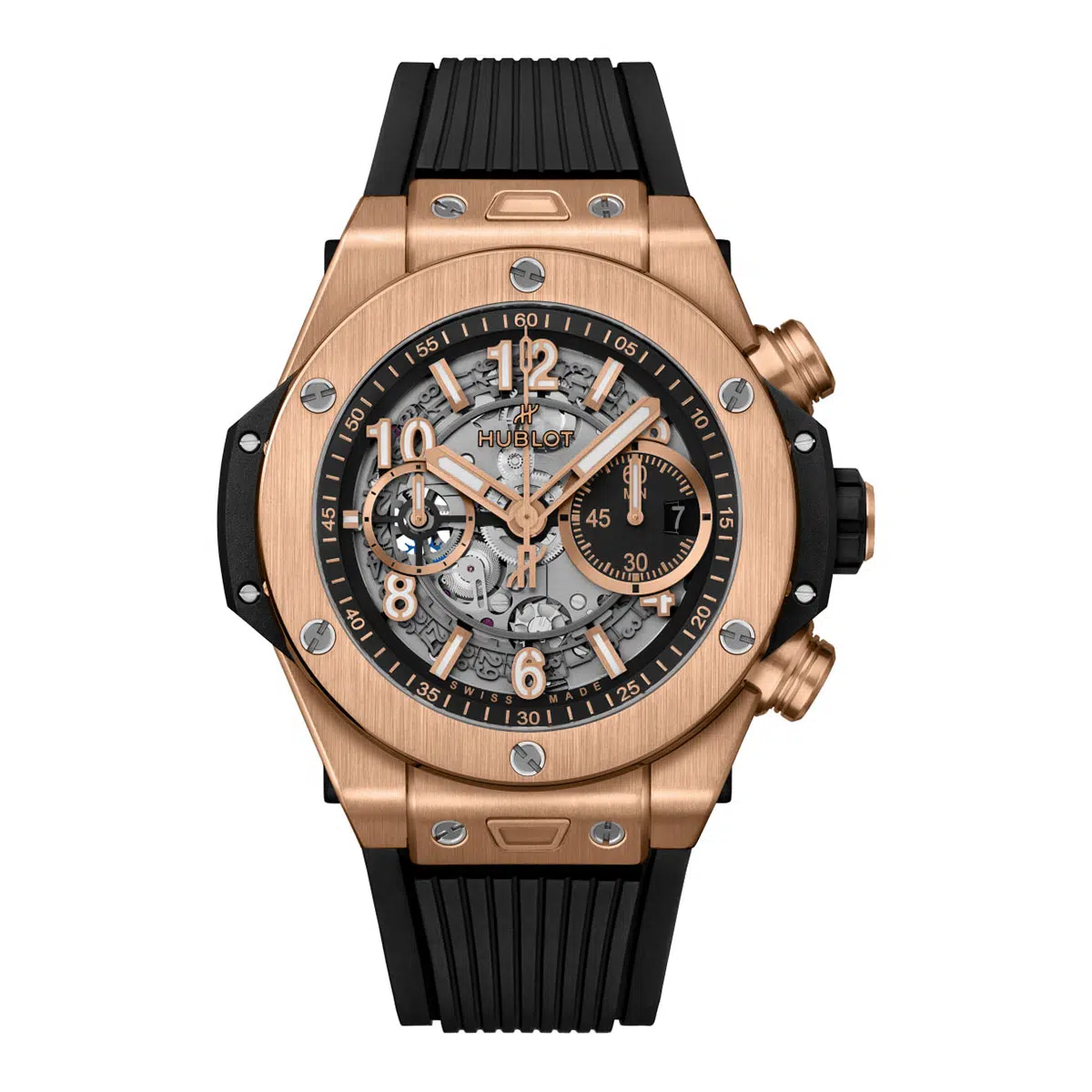 The Hublot Big Bang 44 mm (ref. 421-OX-1180-RX) features an automatic movement; Black skeleton dial with luminescent markers arabic numerals and index markings, luminescent hands, transparent case back; and 44 mm, 18k rose gold case on a rubber strap with a 18k rose gold folding clasp.