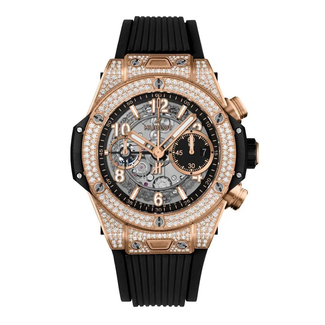 The Hublot Big Bang 42 mm (ref. 441-OX-1181-RX-1704) features an automatic movement; black skeleton dial with luminescent markers arabic numerals and index markings, luminescent hands; sapphire-crystal, transparent case back; and 42 mm, 18k rose gold with diamonds case on a leather strap with a 18k rose gold folding clasp.