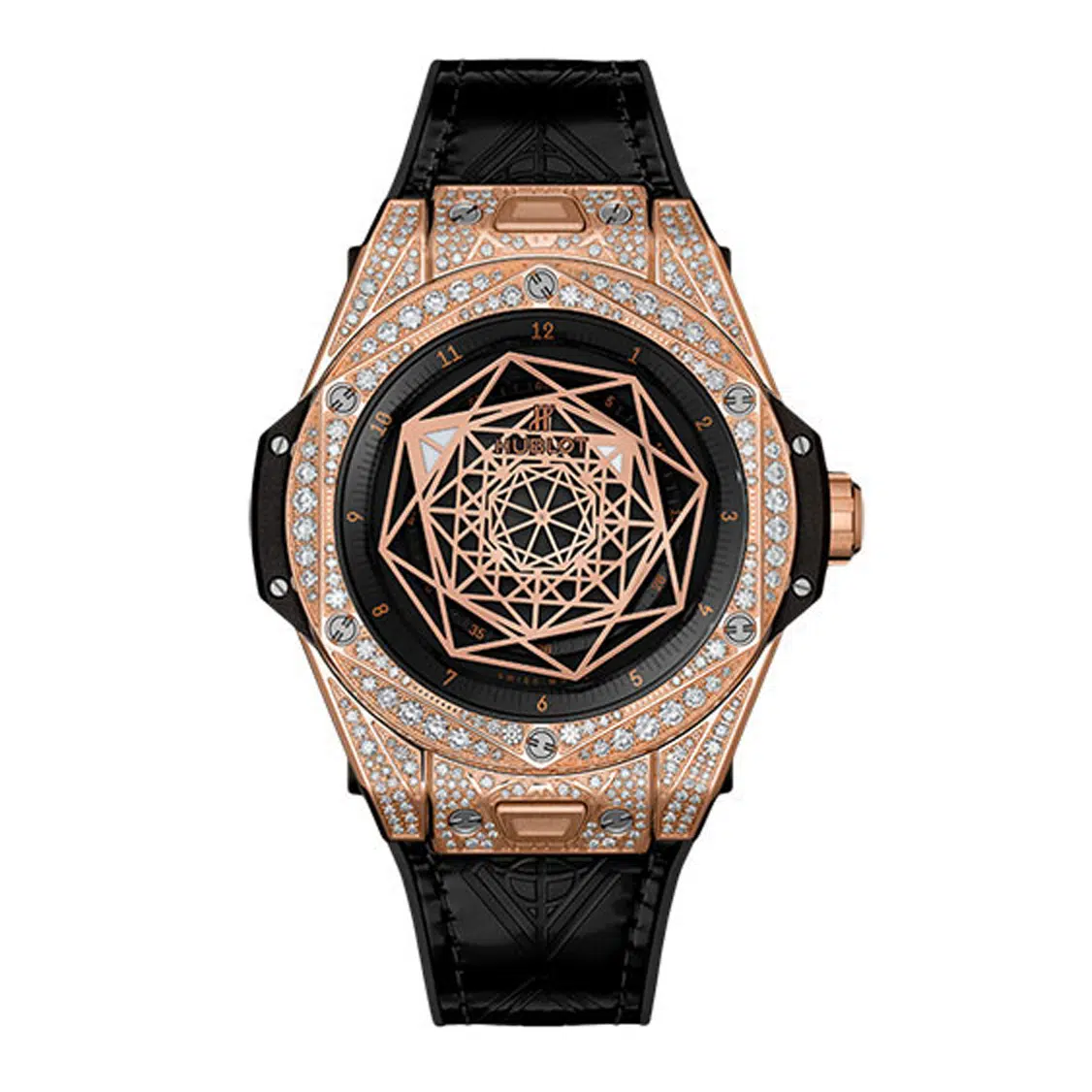 The Hublot Big Bang 39 mm (ref. 465-OS-1118-VR-1704-MXM18) features an automatic movement; black with arabic numerals; sapphire-crystal, transparent case back; and 39 mm, 18k rose gold and diamonds case on a leather strap with a 18k rose gold folding clasp.