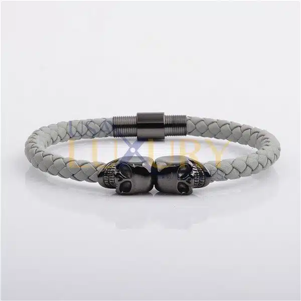 Mens Skull Bio Magnetic Real Leather Bracelet Stainless Steel Gray Strap