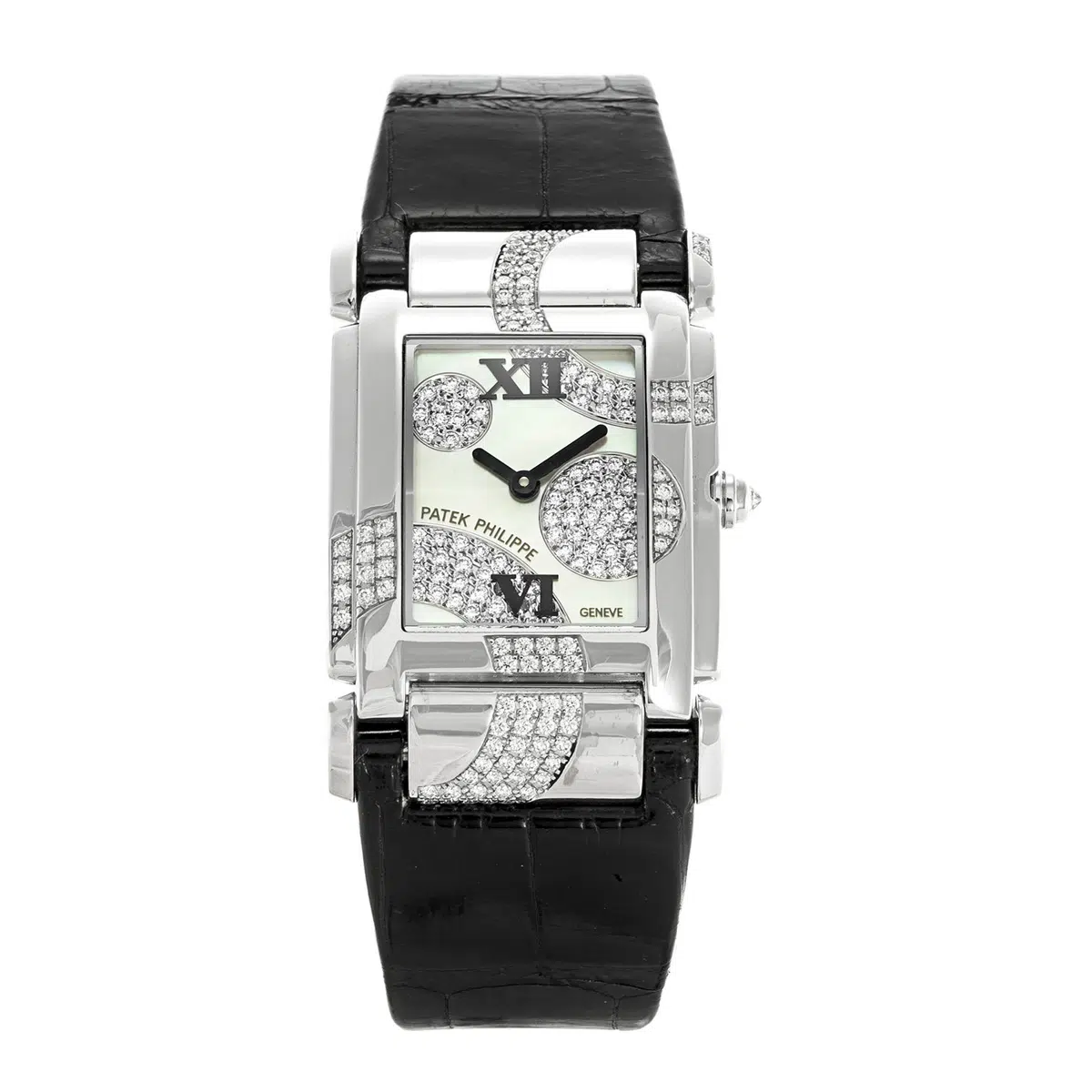The Patek Twenty-4 (ref. 4914G-001) features an automatic movement; diamonds dial; sapphire-crystal, transparent case back; and 25×41 mm, 18k white gold case on a leather strap with folding clasp.