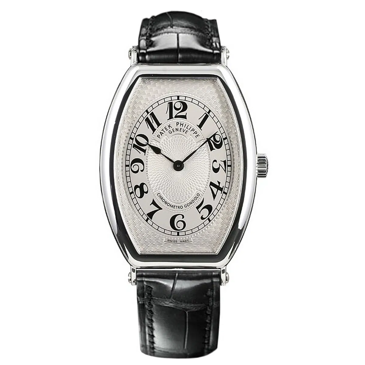 The Patek Philippe Gondolo (ref. 5098P) features an manual movement; silver dial; sapphire-crystal, transparent case back; and 42 X 32 mm, platinum case on a leather strap with an platinum folding clasp.