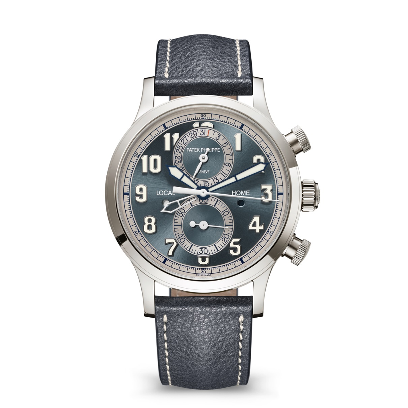 The Patek Philippe Complications 5924G-001 marks a significant milestone as the manufacturer’s first chronograph within its aviation-inspired collection, blending traditional watchmaking excellence with contemporary functionality. This white gold timepiece embodies Patek Philippe’s philosophy of creating instruments that transcend generations, featuring a sophisticated flyback chronograph mechanism that allows instantaneous resetting and restarting—an essential feature for pilots and global travelers. The Travel Time complication enables effortless switching between two time zones while maintaining perfect synchronization with the date function. The sunburst blue-gray dial, with its luminous white gold Arabic numerals and sword-shaped hands, reflects Patek Philippe’s meticulous attention to aesthetic harmony and practical legibility. The self-winding Caliber CH 28-520 C FUS movement, visible through the sapphire crystal case back, showcases the brand’s legendary finishing techniques and technical prowess. Ideal for discerning collectors and frequent travelers, this watch combines aviation functionality with Patek Philippe’s signature elegance, making it equally suited for boardroom meetings, formal occasions, or international journeys. The navy blue grained calfskin strap provides both comfort and sophistication, completing a timepiece that represents the perfect balance between technical innovation and timeless design.