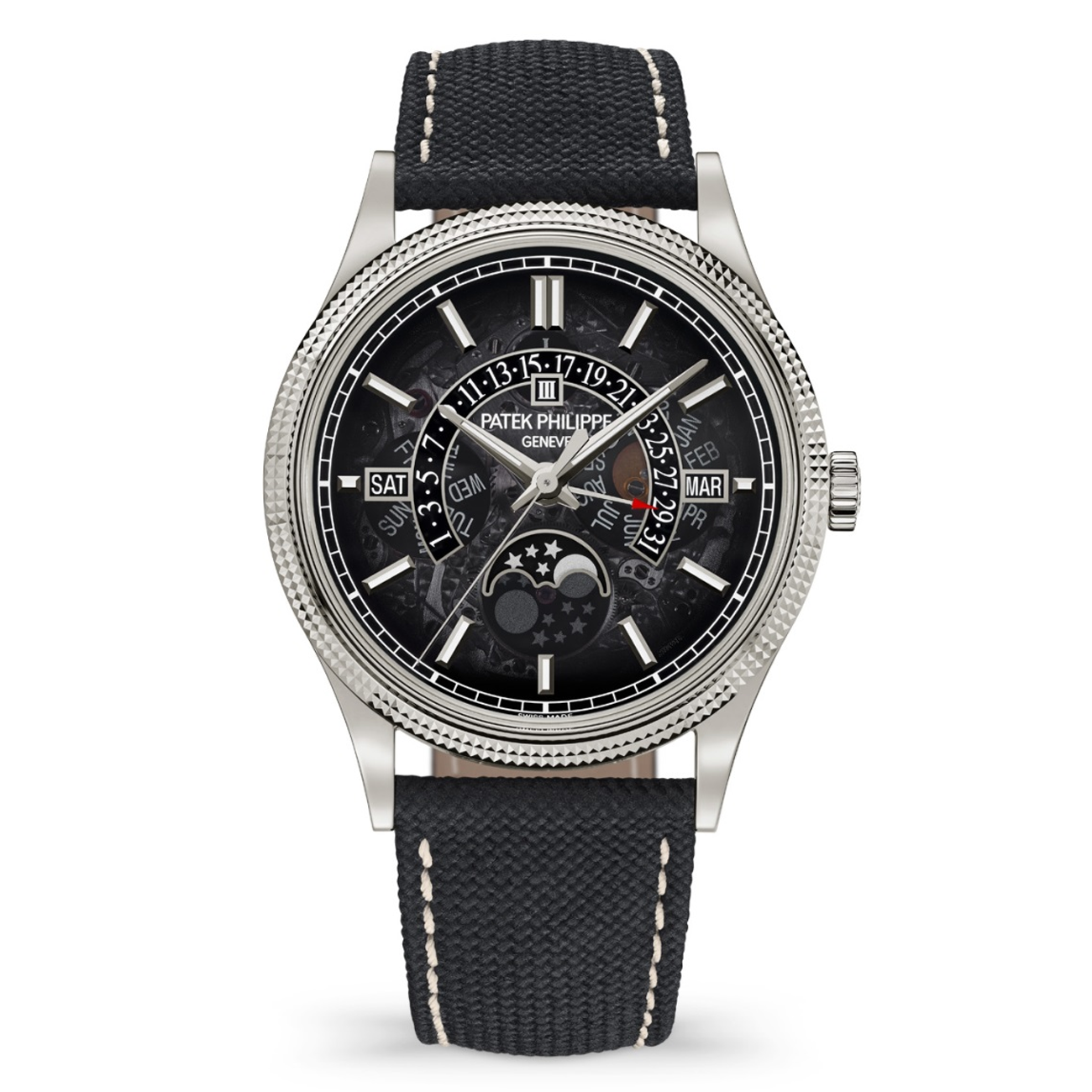 The Patek Philippe Grand Complications 6159G-001 stands as a testament to the brand’s enduring legacy in haute horology, seamlessly blending traditional craftsmanship with contemporary design sensibilities. This perpetual calendar masterpiece features the advanced Caliber 26-330 S QR movement, visible through the innovative gray metallized sapphire dial that provides a captivating window into mechanical artistry. The 39.5mm white gold case showcases Patek Philippe’s signature hobnail guilloché pattern, a decorative technique requiring exceptional skill and precision. The complex display includes a retrograde date hand that gracefully returns to its starting position each month, complemented by carefully positioned apertures for day, month, leap year cycle, and moon phase indications. Each complication reflects generations of watchmaking expertise, with the moon phase display accurate to within one day’s deviation every 122 years. Ideal for formal occasions, boardroom settings, and as a family heirloom, this timepiece embodies understated elegance and technical mastery. The black composite leather strap ensures comfortable wearability while maintaining the watch’s refined aesthetic, making it suitable for both daily wear and special events where sophistication and horological appreciation converge.