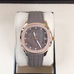 The Patek Philippe Aquanaut collection, introduced in 1997, represents the brand’s modern interpretation of luxury sports watches while maintaining the house’s commitment to exceptional craftsmanship. The 5268/200R-010 model exemplifies this philosophy with its elegant 38.8mm rose gold case that masterfully combines polished and satin-brushed surfaces, creating a play of light that enhances its sophisticated presence. The rounded octagonal bezel, set with 48 brilliant-cut diamonds, adds a touch of luxury without compromising the watch’s sporty character. The warm taupe dial features the distinctive Aquanaut embossed pattern, providing excellent legibility through its Arabic numerals and luminescent hands. Powered by the advanced Caliber 26-330 S C/430, this self-winding movement incorporates Patek Philippe’s latest technical innovations including the Gyromax® balance and Spiromax® balance spring for superior precision. The matching composite strap, developed specifically for the Aquanaut line, offers exceptional durability and comfort for daily wear. This timepiece transitions seamlessly from casual daytime occasions to elegant evening events, making it an ideal companion for the modern collector who appreciates both technical excellence and aesthetic refinement. As with all Patek Philippe creations, this watch is designed to become a cherished heirloom, representing the brand’s commitment to creating timepieces that transcend generations.