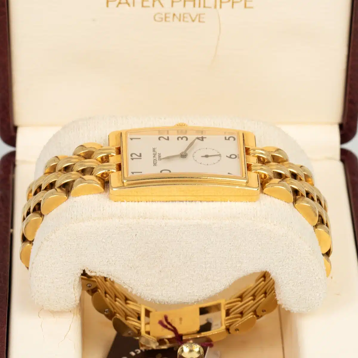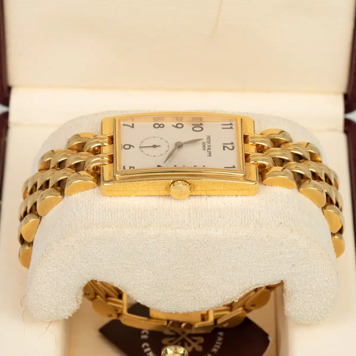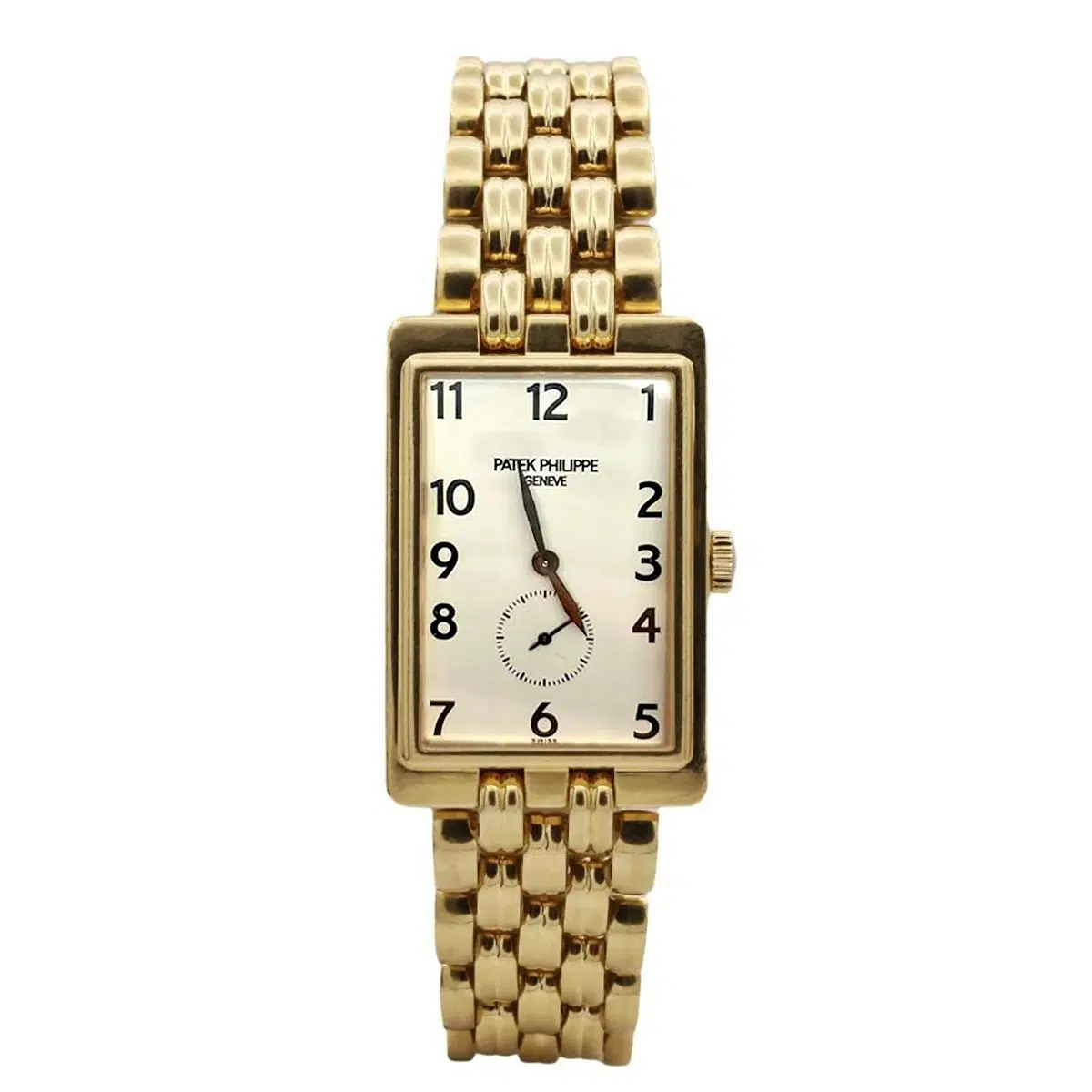 Yellow gold-tone 18kt yellow gold case with an 18kt yellow gold band. Fixed yellow gold-tone 18kt yellow gold bezel. White dial with black hands with black Arabic numeral hour markers. Dial Type: Analog. Quartz movement. Scratch resistant sapphire crystal. Pull / push crown. Solid case back. Rectangle case shape, case size: 26 mm, case thickness: 6 mm. The watch presented on an 18k yellow gold bracelet with an 18k yellow gold clasp buckle. Functions: hour, minute, second. Gondolo Series. Luxury watch style. The movement is Manual Winding Caliber Patek Philippe 215 with 18 jewels and 44 hours of power reserve. Water resistance up to 30m/99ft. Swiss Made. Pre-owned Patek Philippe Gondolo Quartz White Dial Men’s Watch 5009/1J-051.