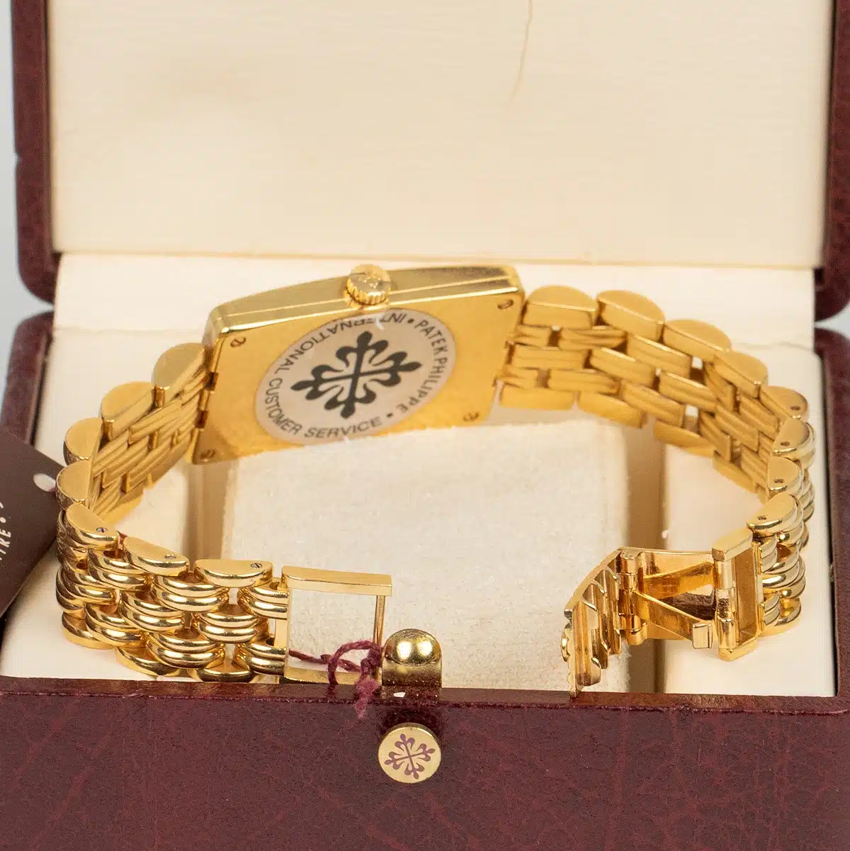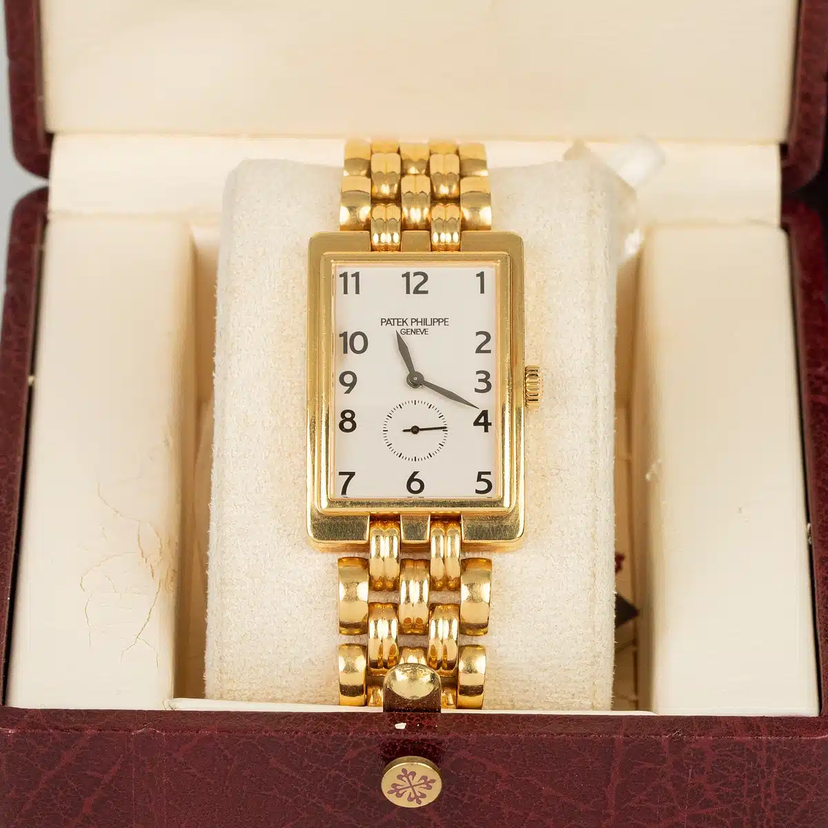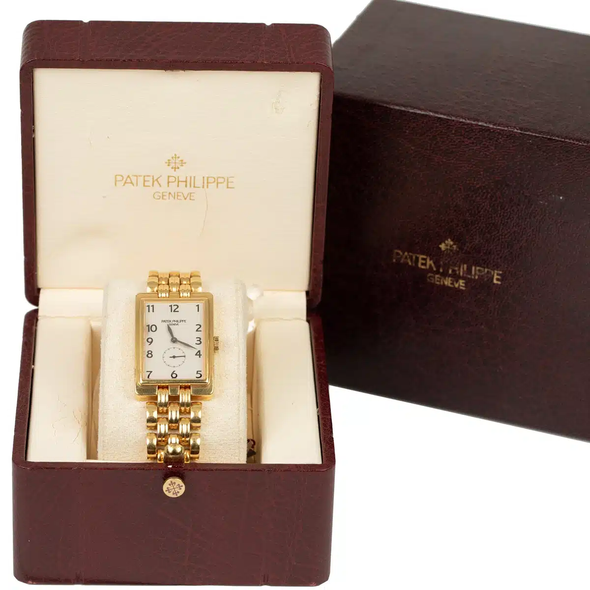 Yellow gold-tone 18kt yellow gold case with an 18kt yellow gold band. Fixed yellow gold-tone 18kt yellow gold bezel. White dial with black hands with black Arabic numeral hour markers. Dial Type: Analog. Quartz movement. Scratch resistant sapphire crystal. Pull / push crown. Solid case back. Rectangle case shape, case size: 26 mm, case thickness: 6 mm. The watch presented on an 18k yellow gold bracelet with an 18k yellow gold clasp buckle. Functions: hour, minute, second. Gondolo Series. Luxury watch style. The movement is Manual Winding Caliber Patek Philippe 215 with 18 jewels and 44 hours of power reserve. Water resistance up to 30m/99ft. Swiss Made. Pre-owned Patek Philippe Gondolo Quartz White Dial Men’s Watch 5009/1J-051.