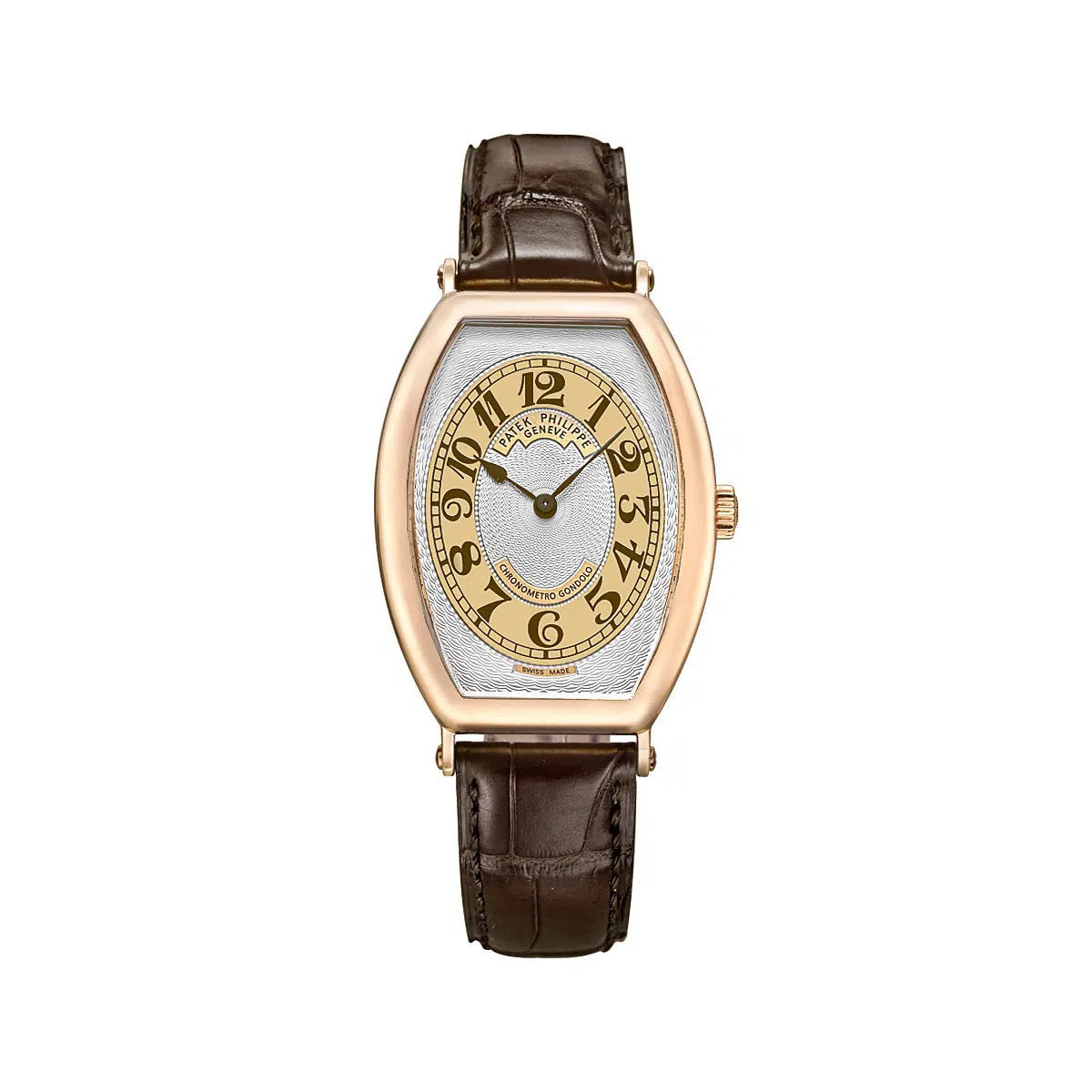 The Patek Philippe Gondolo (ref. 5098R-001) features an mechanical movement; silver dial; sapphire-crystal, transparent case back; and 42×32 mm, 18k rose gold case on a leather strap with a 18k rose gold folding clasp.
