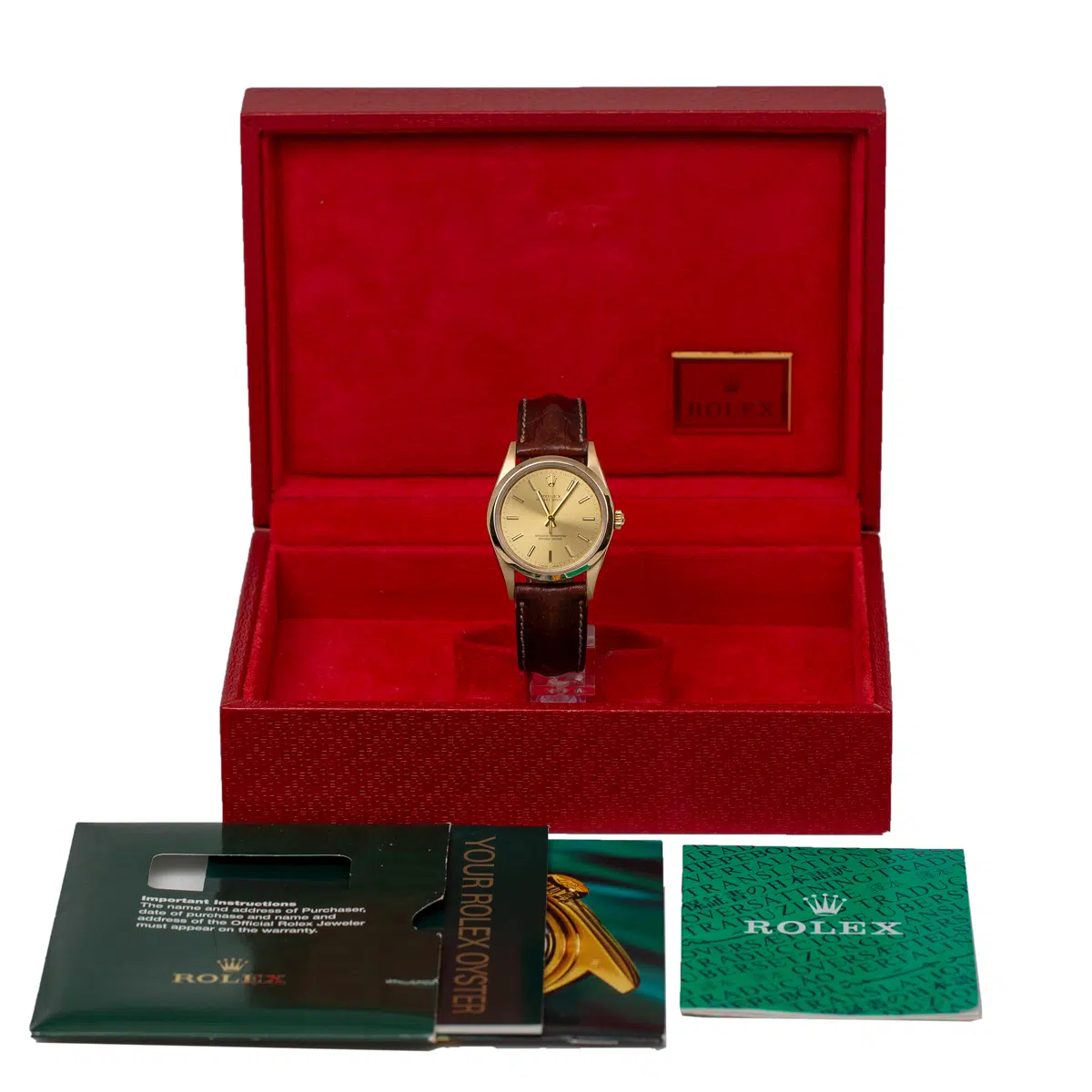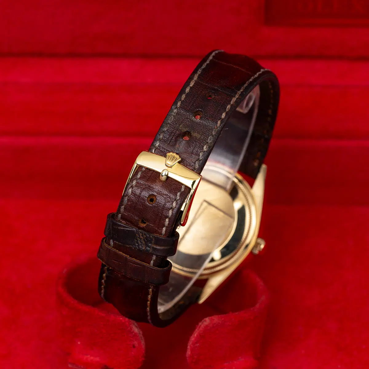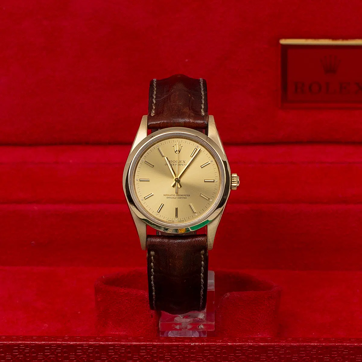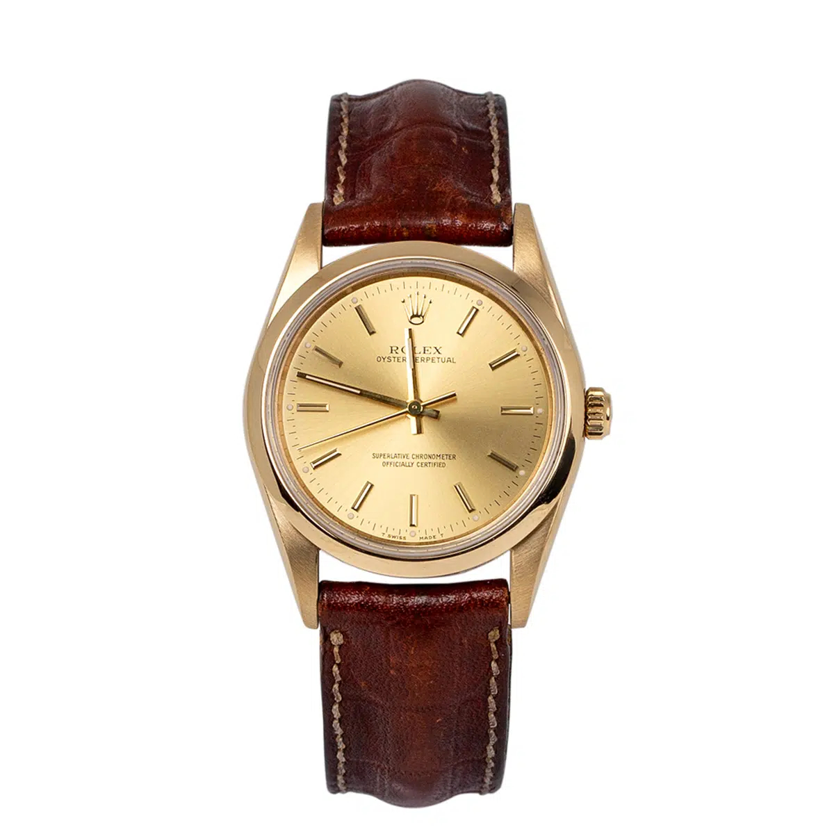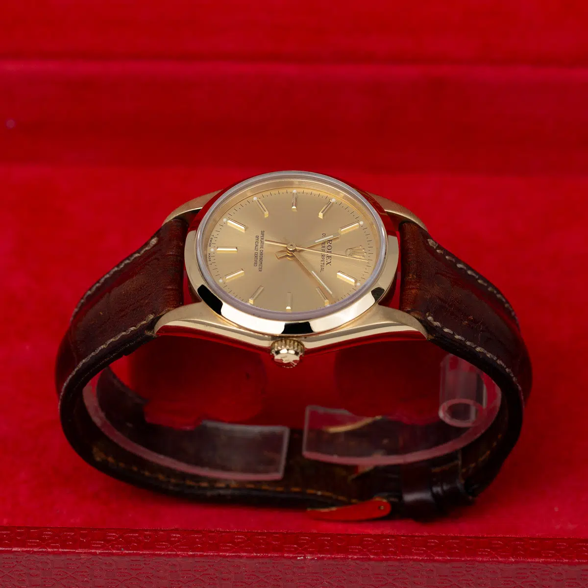 Rolex 14208 Oyster Perpetual Champagne Stick Yellow Gold Brown Leather Strap 34mm Watch