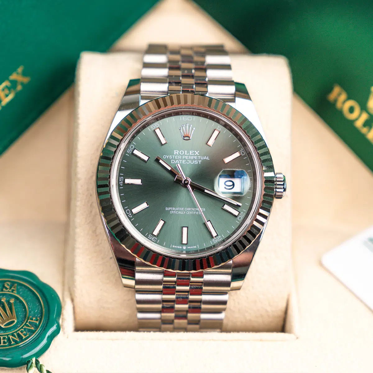 Rolex Datejust 126334-0028 Mint Green Dial Jubilee Bracelet Watch, Complete Set (Rolex Box, Rolex Card)