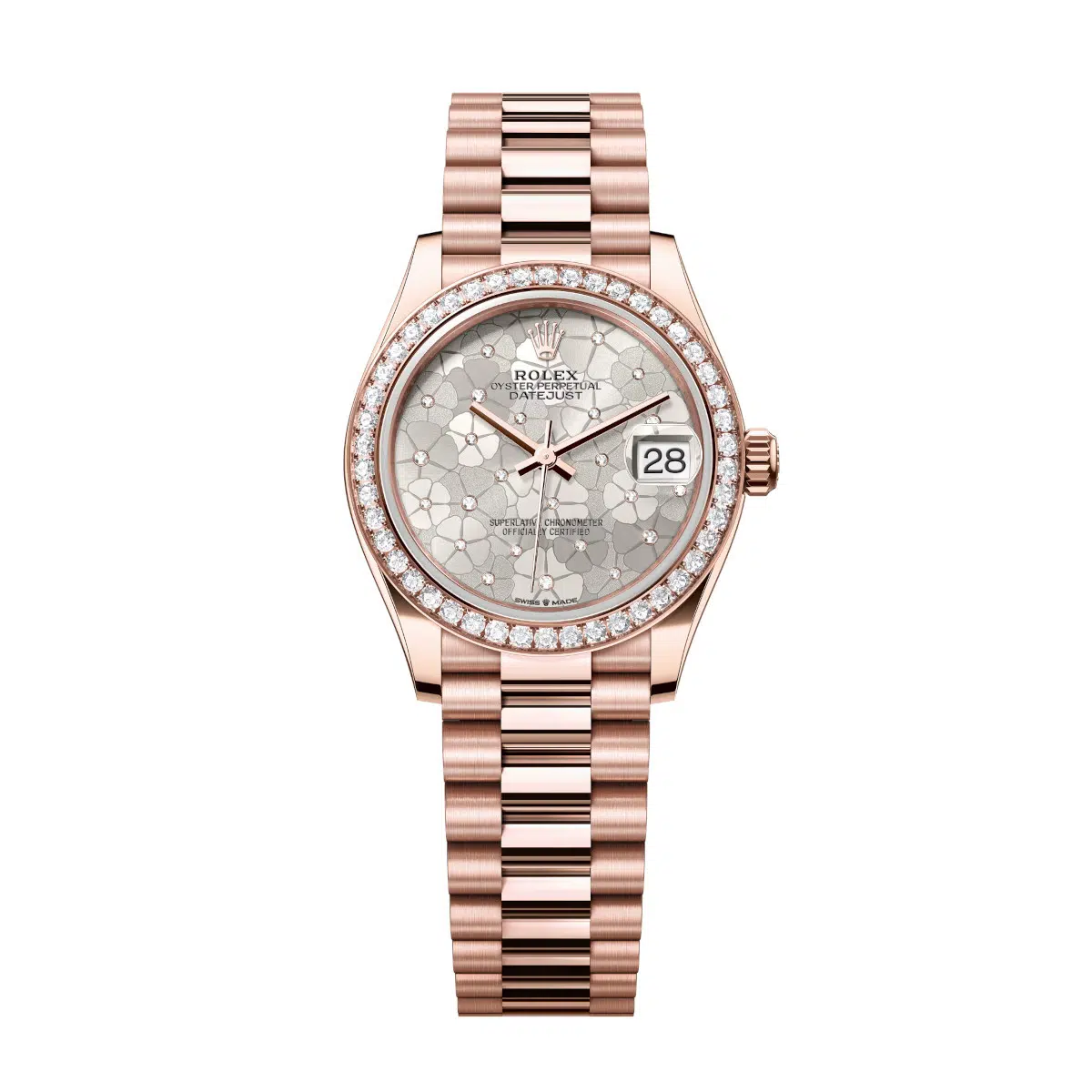 Unworn Rolex Datejust 278285RBR-0036 Silver Floral Motif Set with Diamonds 31mm Dial Diamond Set Bezel President Bracelet Watch