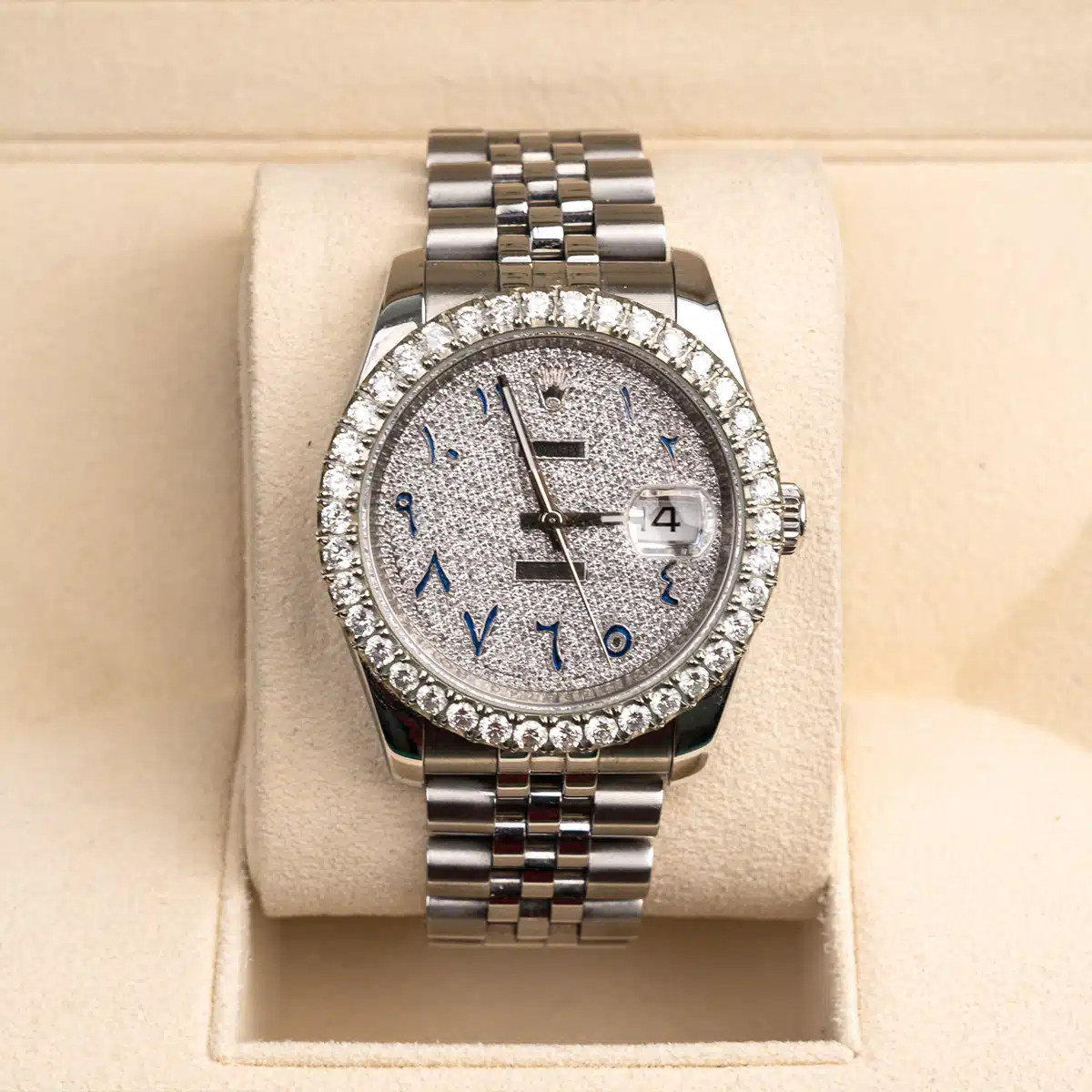 Aftermarket Diamond bezel. Aftermarket Diamond dial. Date window at 3 o’clock aperture. Stainless steel jubilee bracelet with a hidden clasp. Fits 7 3/4″ wrist.