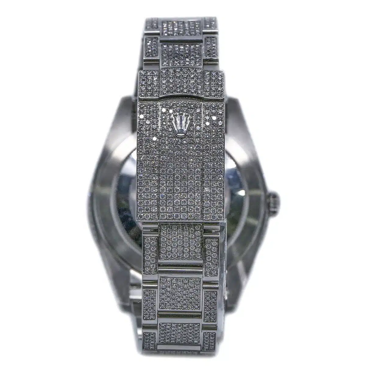 Rolex Calibre 3235 Automatic movement, based upon Rolex 3035, containing 31 Jewels, bitting at 28800 vph, and has a power reserve of approximately 70 hours. With date at 3 o’clock that changes instantaneously at midnight in a few thousandths of a second, approximately 70 hours of power reserve, Iced-out Oyster bracelet with flat three-piece links, folding Oysterclasp buckle with Easylink 5mm comfort extension link. Waterproof to 100 meters / 330 feet.
