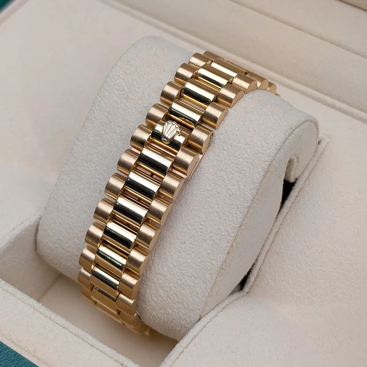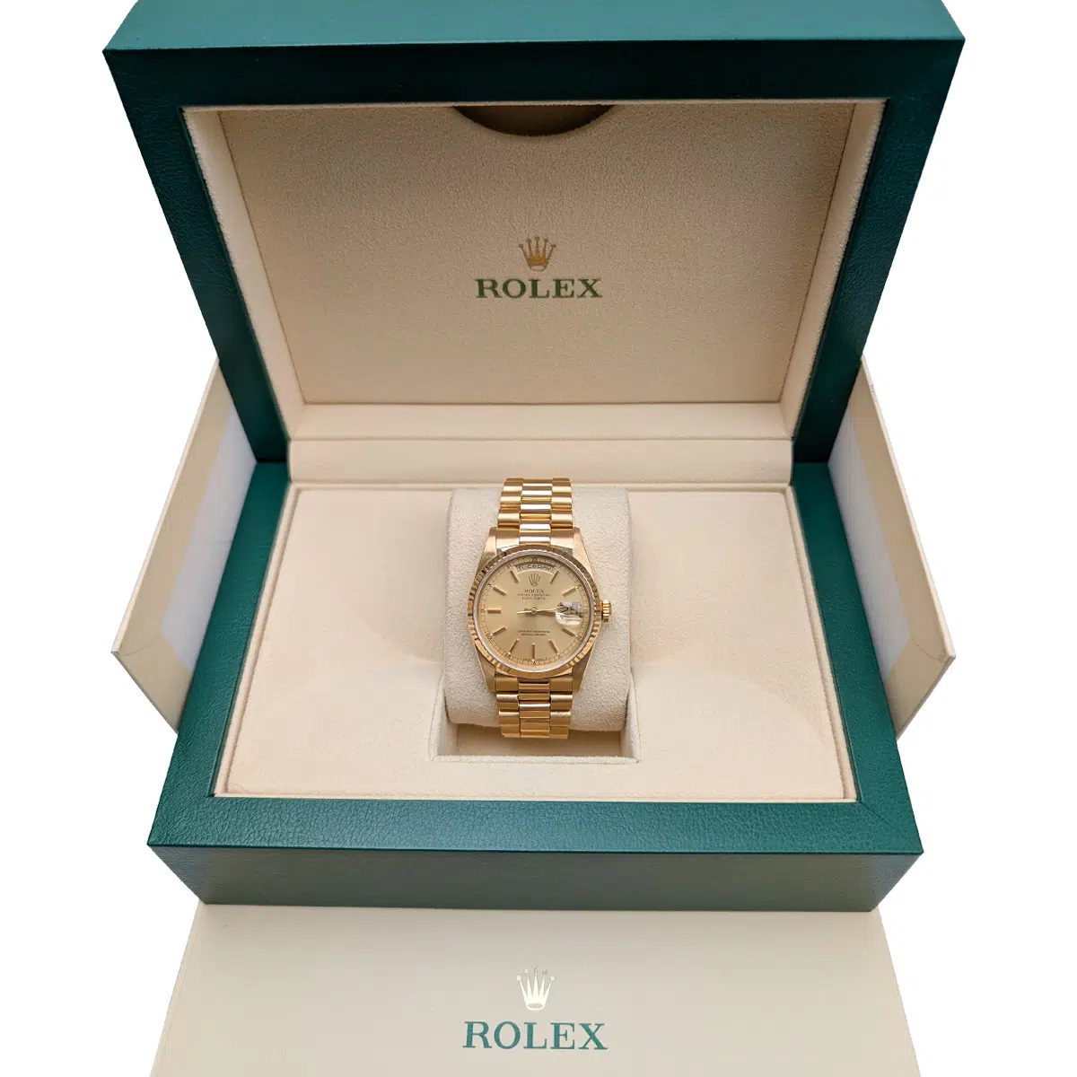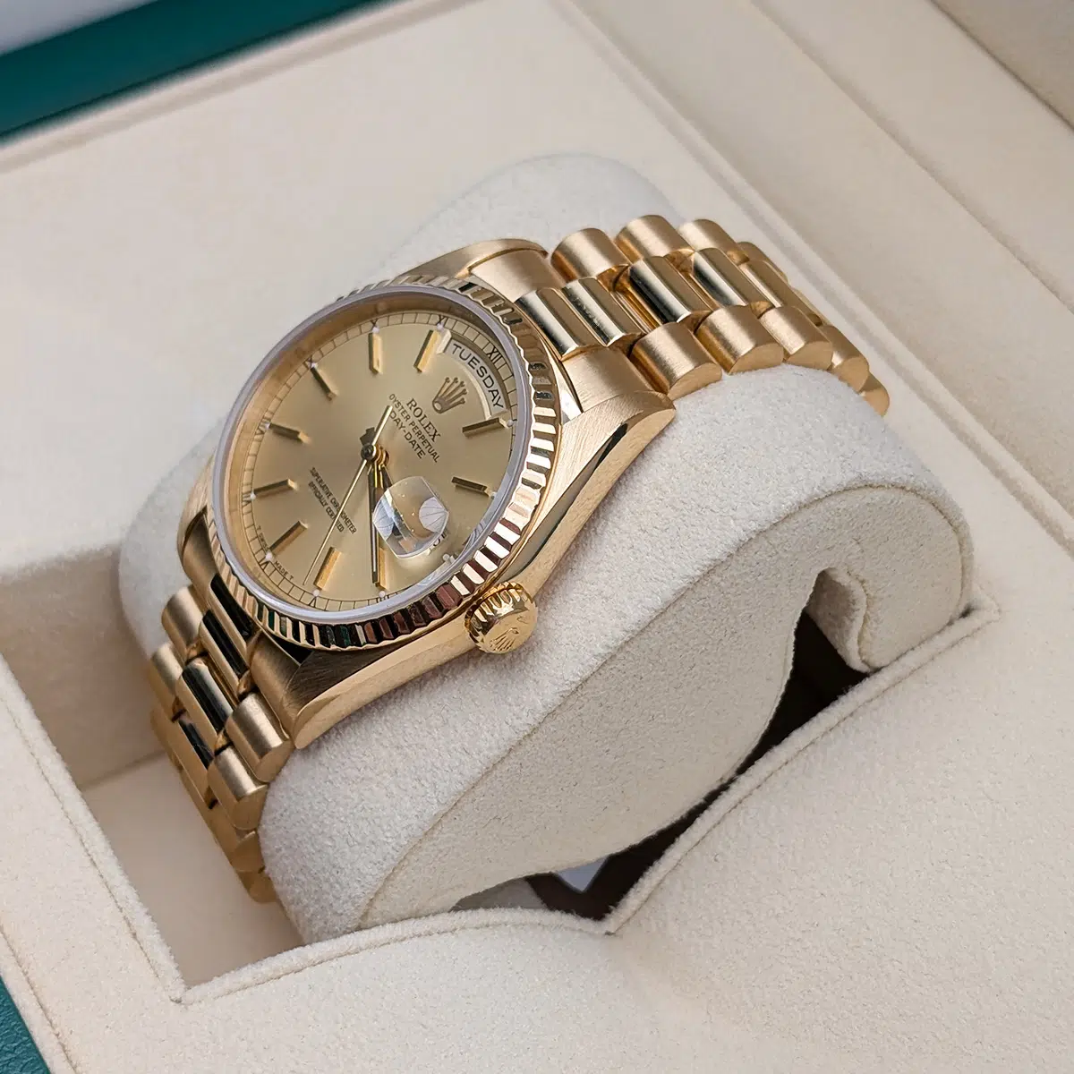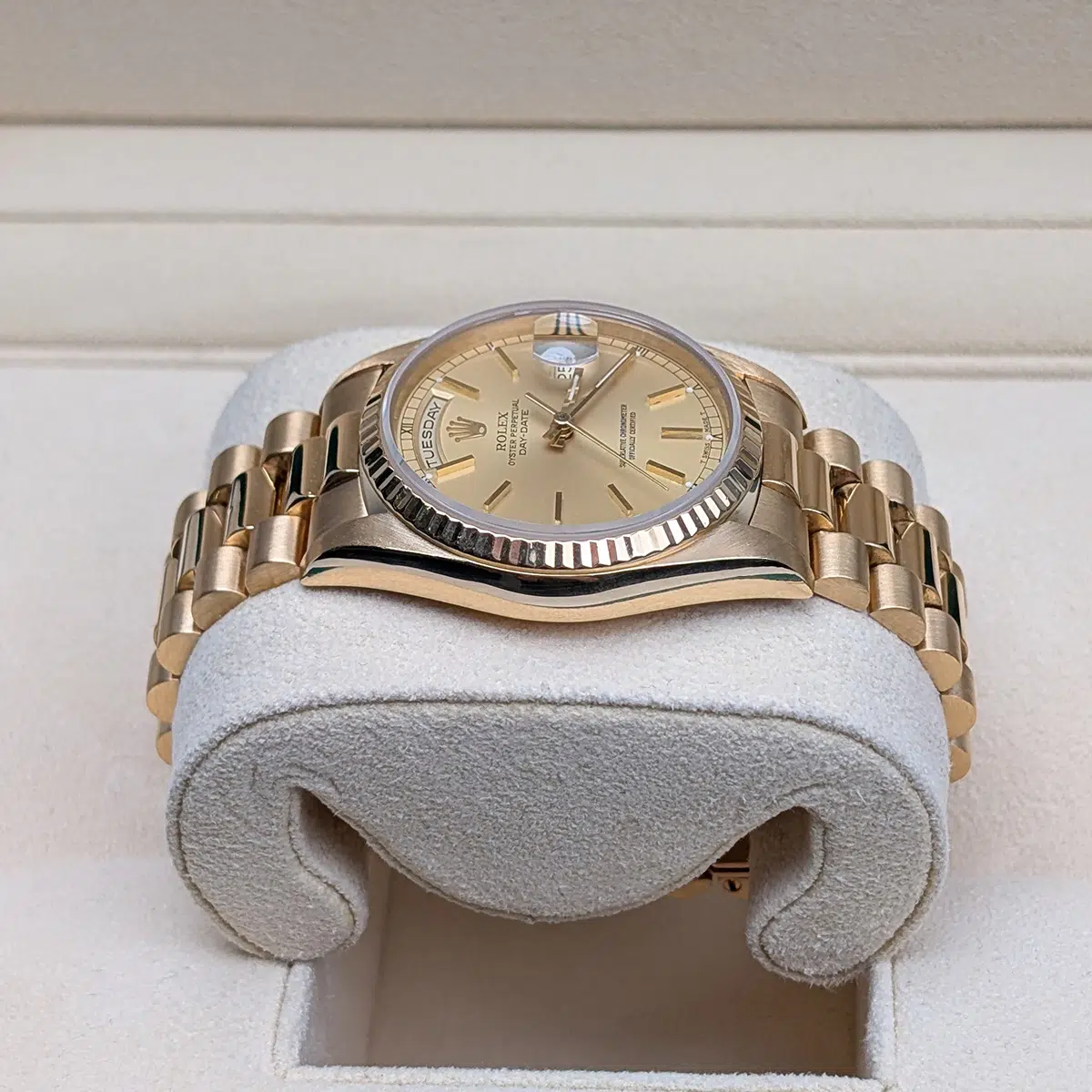 Yellow gold-tone 18kt yellow gold case with a yellow gold-tone 18kt yellow gold president bracelet. Fixed yellow gold-tone 18kt yellow gold bezel. Champagne dial with yellow gold-tone hands and Stick hour markers. Minute markers around the outer rim. Dial Type: Analog. Date display at the 3 o’clock position.