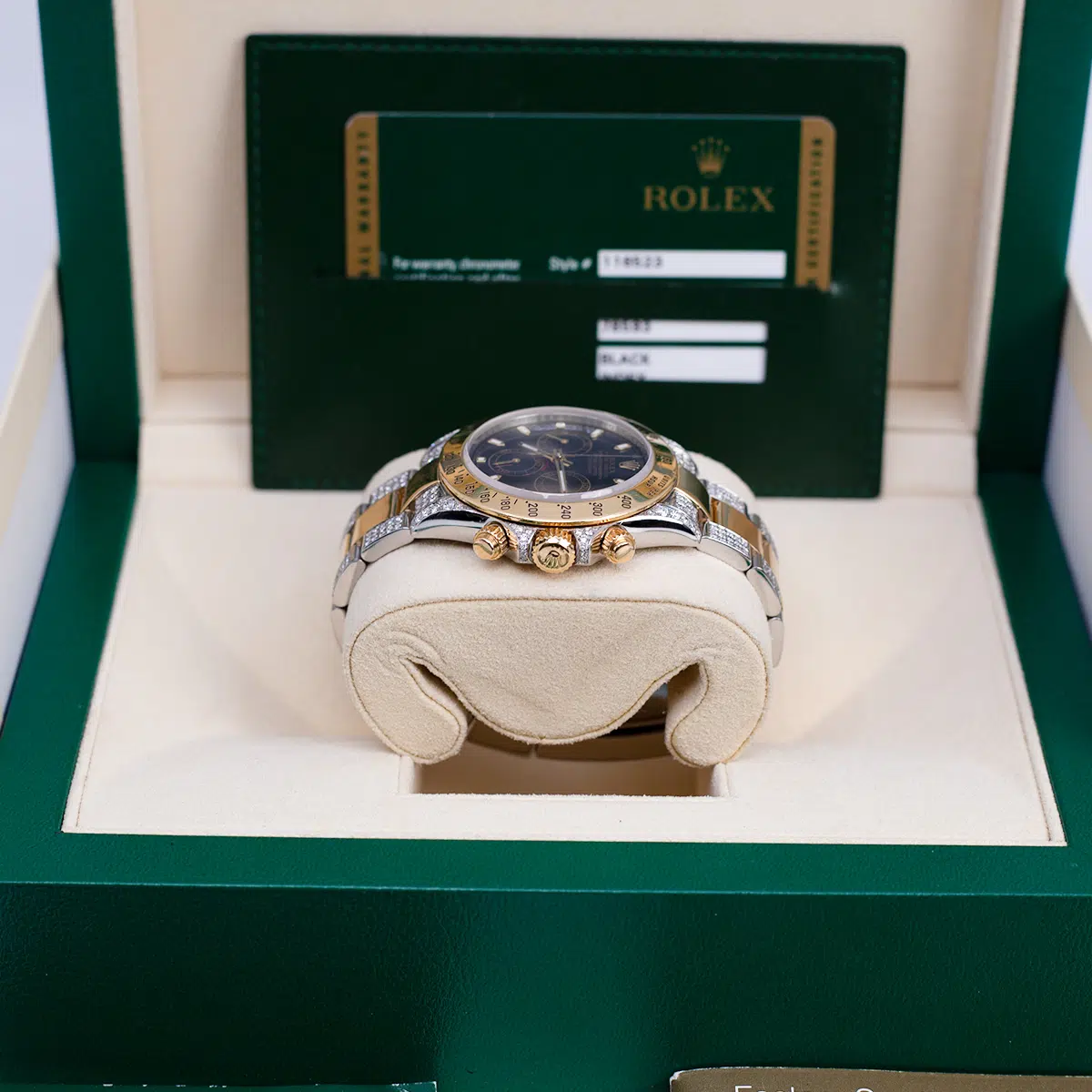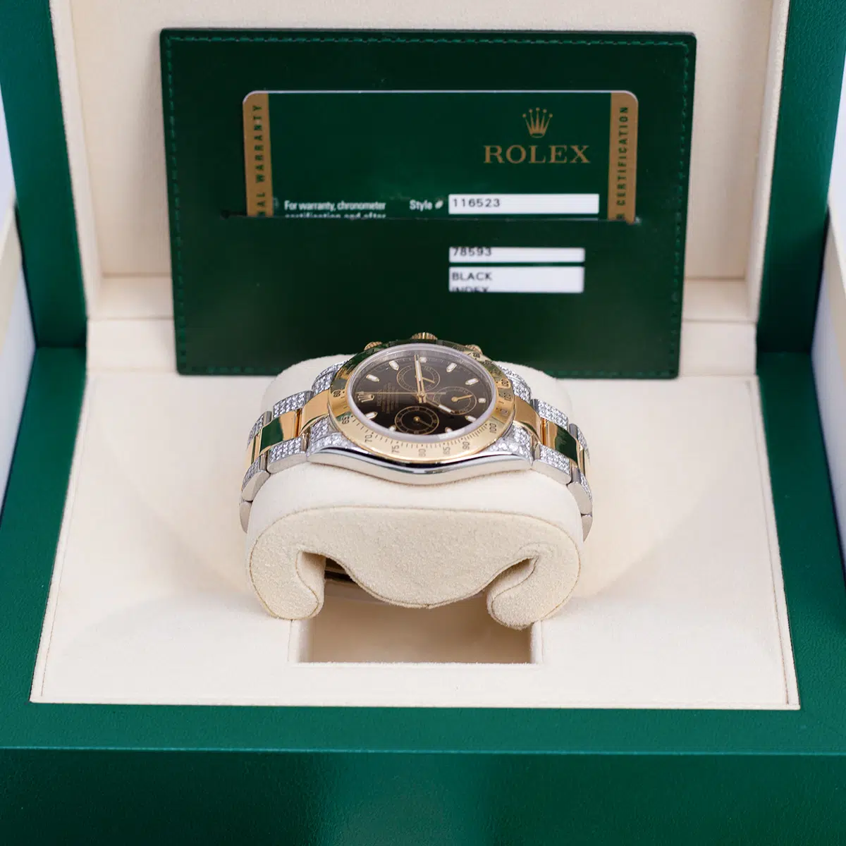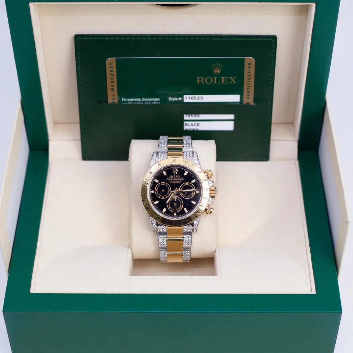 Rolex Daytona 116523 Black Dial Aftermarket Iced Out Bracelet and Lugs 40mm $24,000.00