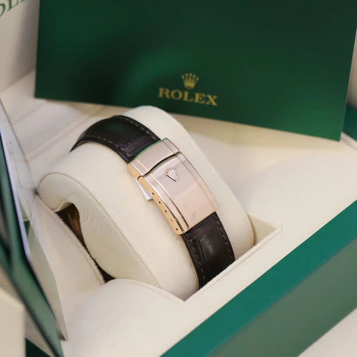 Rolex calibre 9001 automatic movement with a 72-hour power, second time-zone displayed via off-center rotating disc, Saros annual calendar with date at 3 o’clock and month indicated in discrete apertures at each of the 12 hour marks, brown leather strap, folding Oysterclasp buckle. Waterproof to 100 meters / 330 feet.