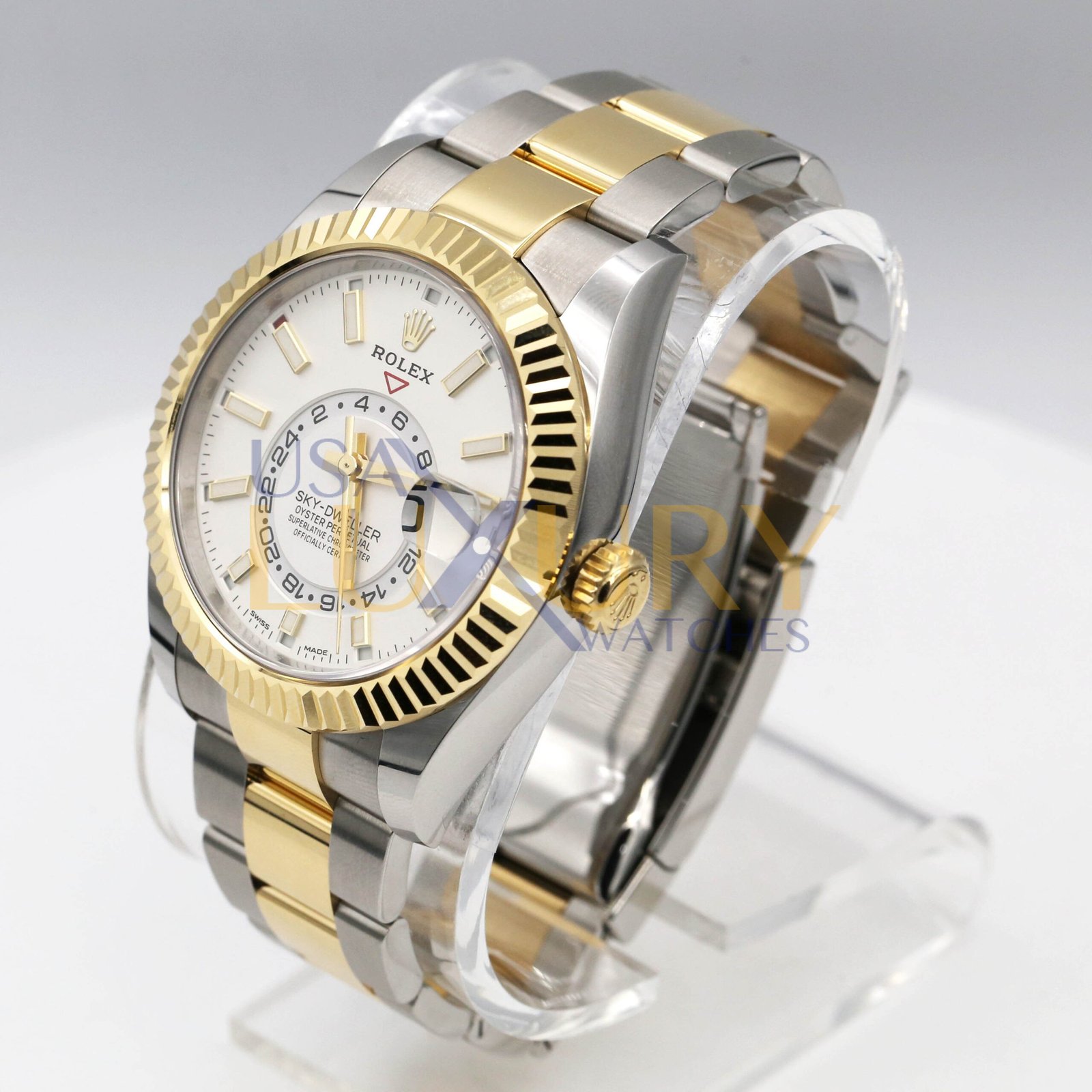 Rolex calibre 9001 automatic movement , second time-zone displayed via off-center rotating disc, Saros annual calendar with date at 3 o’clock and month indicated in discrete apertures at each of the 12 hour marks, stainless steel and 18K yellow gold Oyster bracelet, folding Oysterclasp buckle with Easylink 5mm comfort extension link. Waterproof to 100 meters.