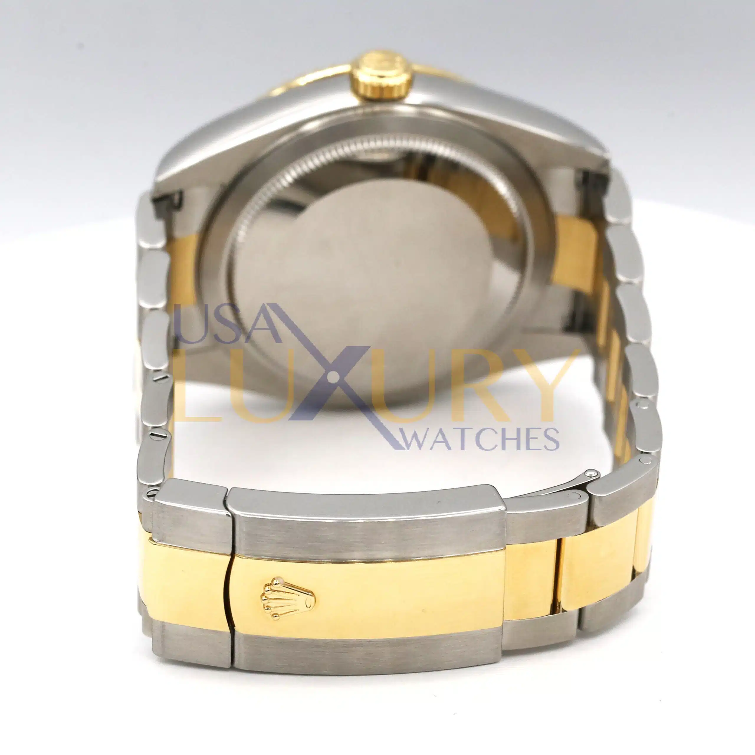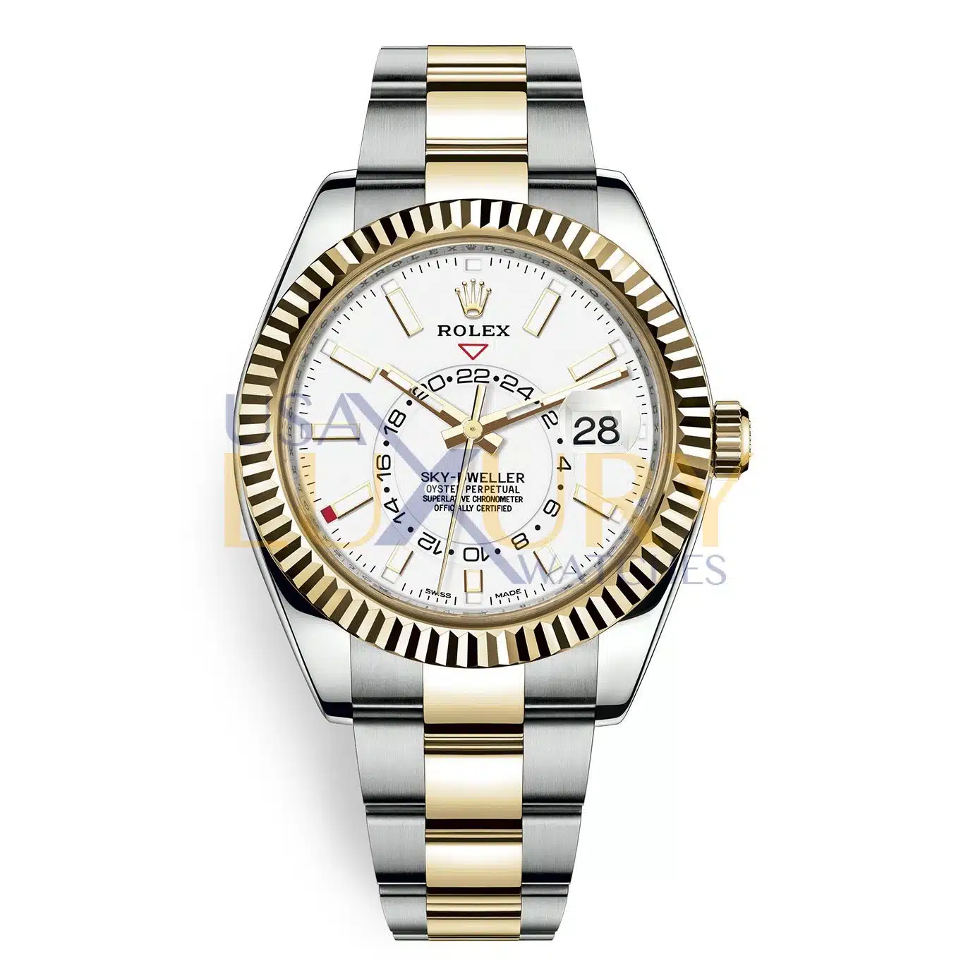 42mm yellow Rolesor case comprised of a 904L steel monobloc middle case, screw-down back, screw-down crown, 18K yellow gold fluted bezel with bidirectional rotatable Rolex Ring Command, scratch-resistant sapphire crystal with cyclops lens over the date and double anti-reflective coating, white dial, index hour markers.