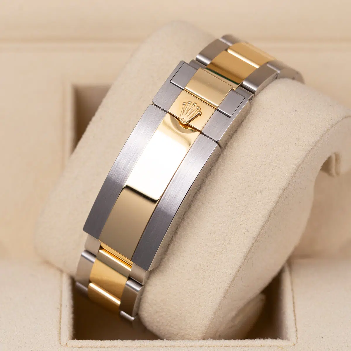 41 mm brushed stainless steel case with yellow gold. polished finished sides. Polished stainless steel Twin lock crown. Black dial. Polished hands, the hours & minute hands with luminous filled tips. Applied polished index hour markers with luminous fill. Fine printed minutes/seconds track. Rolex in-house caliber 3230, & has an approximate power reserve of 70 hours.