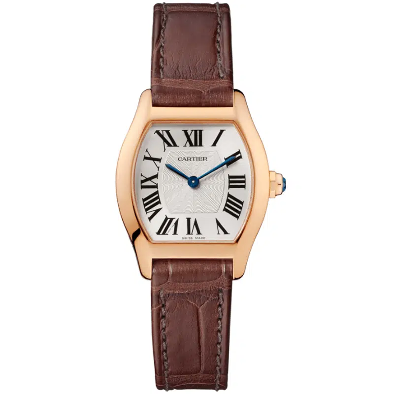 Tortue watch, small model, Manufacture mechanical movement with manual winding, caliber 8970 MC. Case in 18K pink gold, length: 30 mm, width: 24 mm, thickness: 7.3 mm, octagonal crown set with a faceted sapphire, silvered guilloché dial with sunray effect, sword-shaped hands in blued steel, strap in brown alligator skin, ardillon buckle in 18K pink gold, water-resistant to 3 bar (~30 metres).