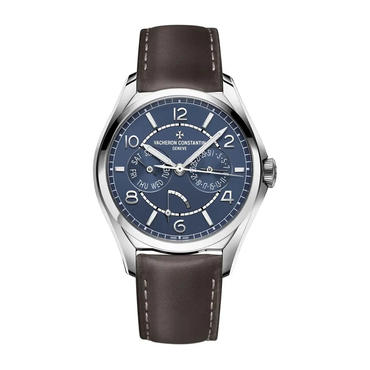 Vacheron Constantin Fiftysix Day-Date (ref 4400E-000A-B943) features an automatic movement; blue whit luminescence dial; sapphire-crystal, transparent case back; and 40 mm, stainless steel case on a leather strap with a stainless steel folding clasp.