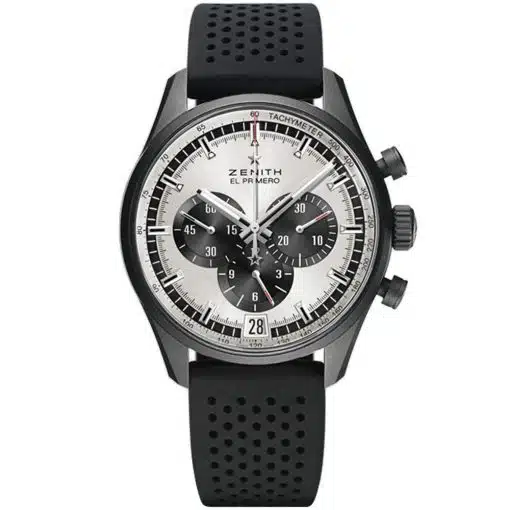 Aluminum with black ceramic finish case with a black rubber strap. Fixed aluminum with black ceramic finish bezel. Silver sunray dial with silver-tone hands and index hour markers. Tachymeter scale around the inner rim. Dial Type: Analog. Luminescent hands and markers. Date display at the 6 o’clock position. Chronograph – sub-dials displaying: three- 60 seconds, 30 minutes, and 12 hours. Zenith Calibre El Primero 400 automatic movement with a 50-hour power reserve.