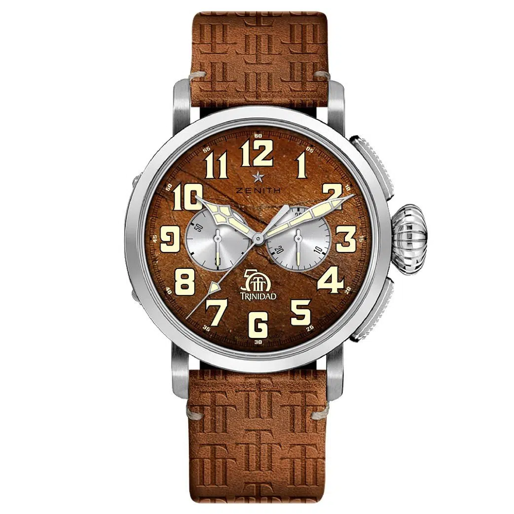 45 mm 18K white gold case, brown tobacco leaf laser texturization dial, El Primero 4069 automatic movement with chronograph, approximately 50 hours of power reserve, havana brown calfskin leather strap with protective rubber lining and trinidad logo pattern, white gold pin buckle buckle. Water resistant to 10 ATM.