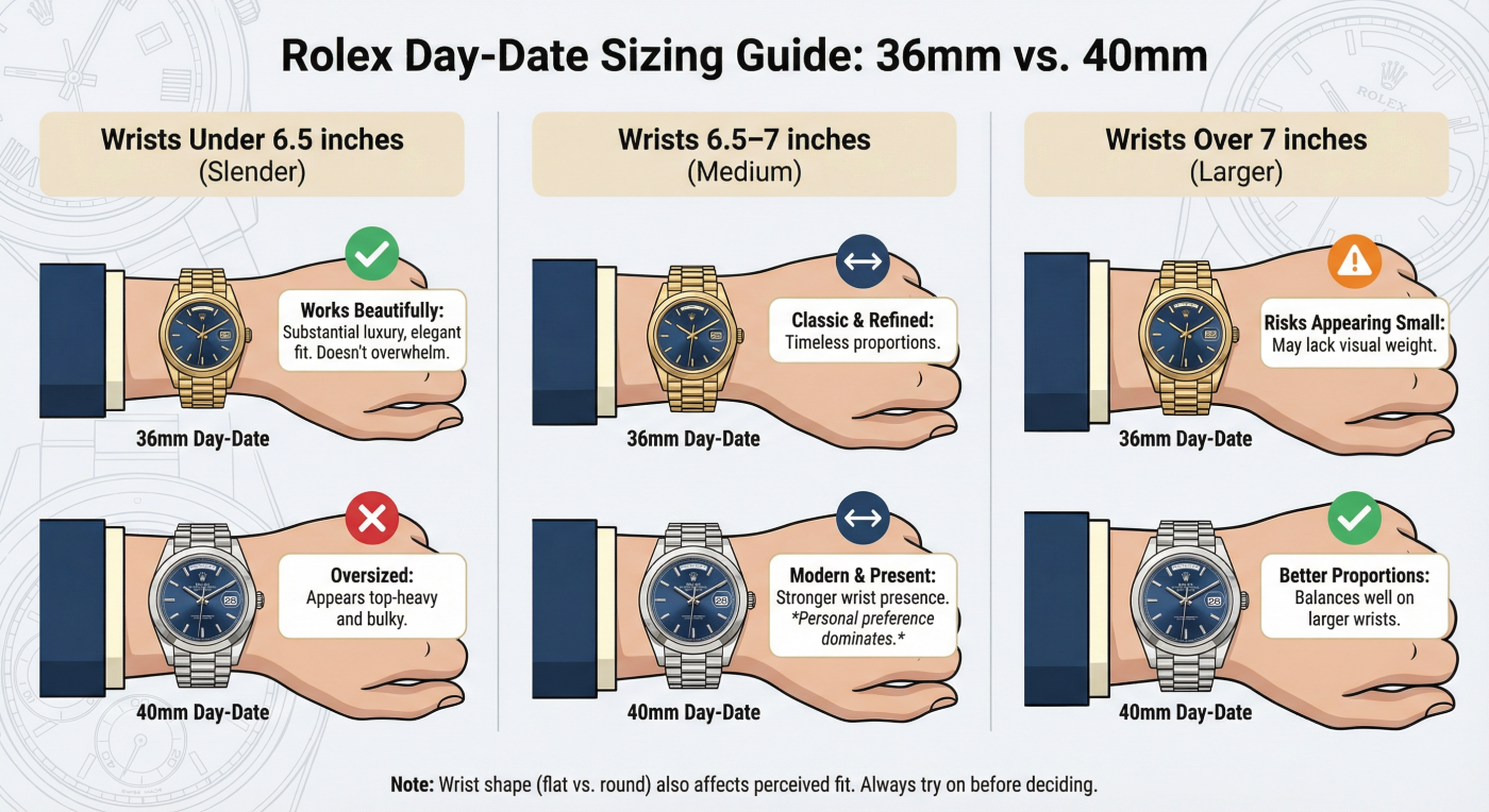 - Wrists over 7 inches: The 40mm Day-Date provides better proportions. The 36mm risks appearing small on larger wrists.​