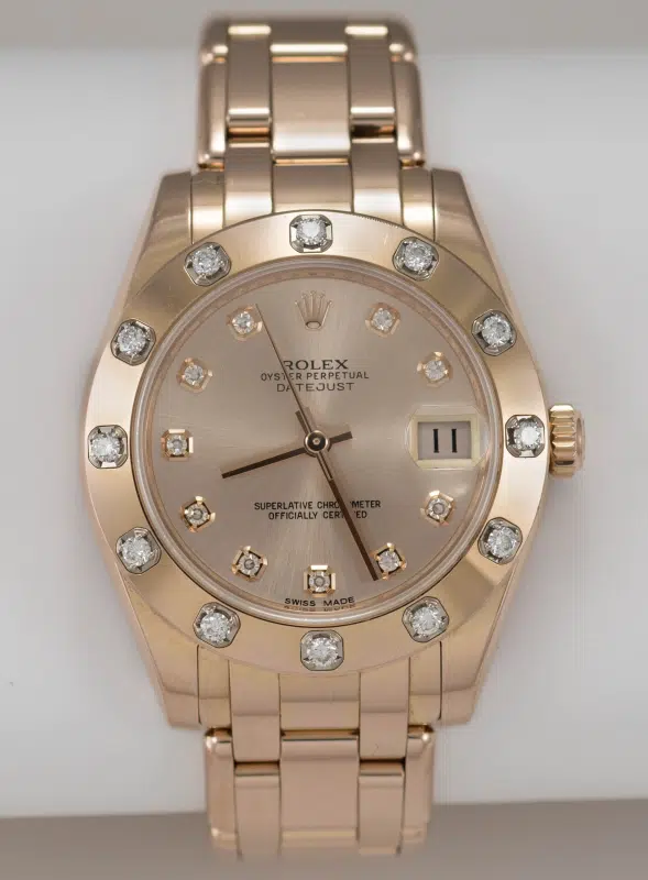 Everose gold—Rolex’s in-house pink gold alloy—combines 18k gold with platinum and copper to ensure enduring hue and corrosion resistance. Exclusive to Rolex since 2005, Everose preserves its warm rose tone over decades, never fading or tarnishing. On the Pearlmaster, Everose sets the ideal canvas for diamond brilliance, creating a symphony of rosy glow and scintillation.