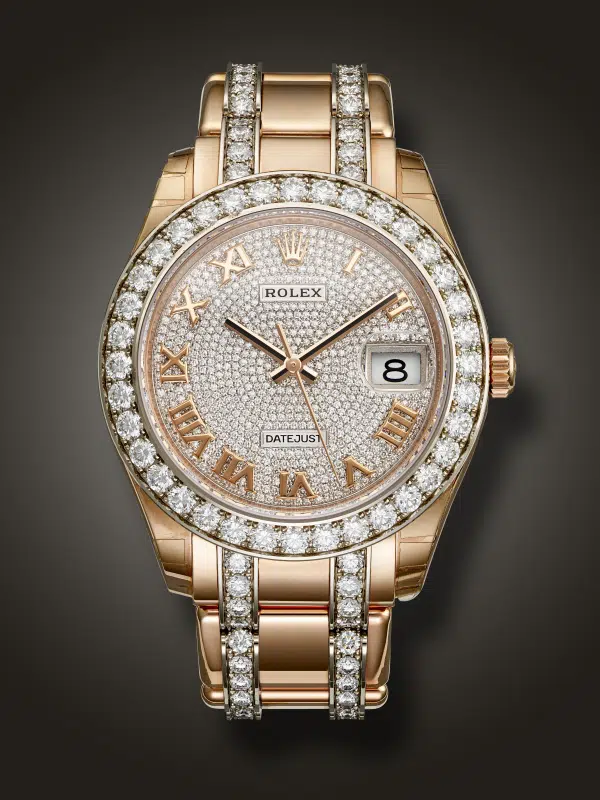 The Pearlmaster’s design vocabulary is defined by fluid lines and meticulous gem setting: