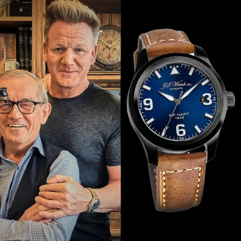Ramsay’s acquisition of the JS Watch Company Blue Sif NART 1948 reflects his genuine love for Iceland and its culture. During one of his frequent visits to the island nation, he made a pilgrimage to JS Watch Company’s small workshop in Reykjavík, where he met the entire team of craftsmen and purchased this unique timepiece directly from its makers. The “NART” designation stands for “North Atlantic Rescue Timer,” honoring Iceland’s maritime rescue services and their decades of service protecting lives in the harsh North Atlantic waters. Priced at $3,034, this piece represents exceptional value for a Swiss automatic movement housed in a thoughtfully designed case with deep cultural significance. The blue sunburst dial and tanned calfskin strap create an elegant combination that speaks to Nordic design sensibilities and maritime heritage.