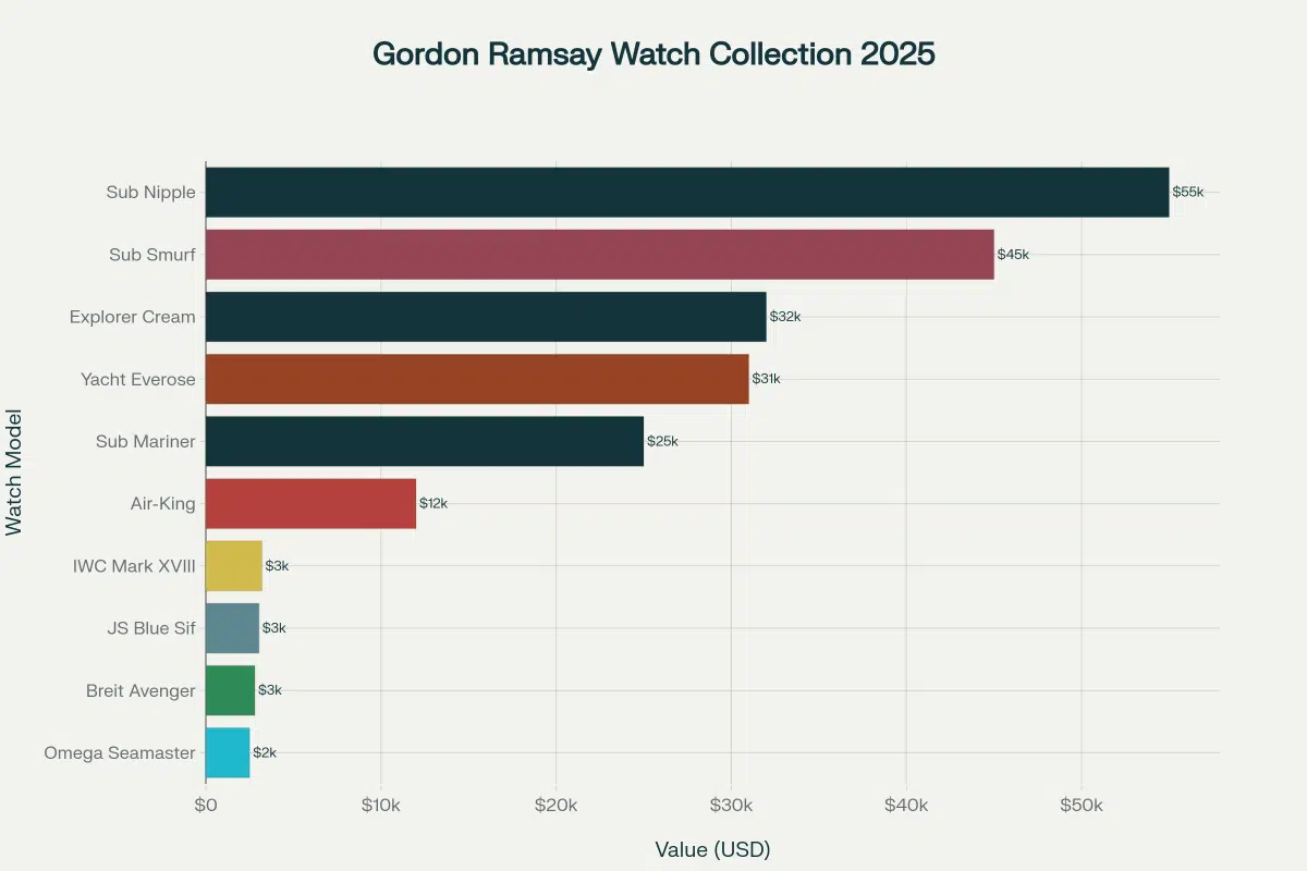 Ramsay’s collection stands out for its vintage Rolex focus combined with functional tool watches, suggesting someone who values both investment potential and practical utility. His willingness to wear a $55,000 gold Submariner during filming demonstrates confidence in his timepieces’ durability and his own success.