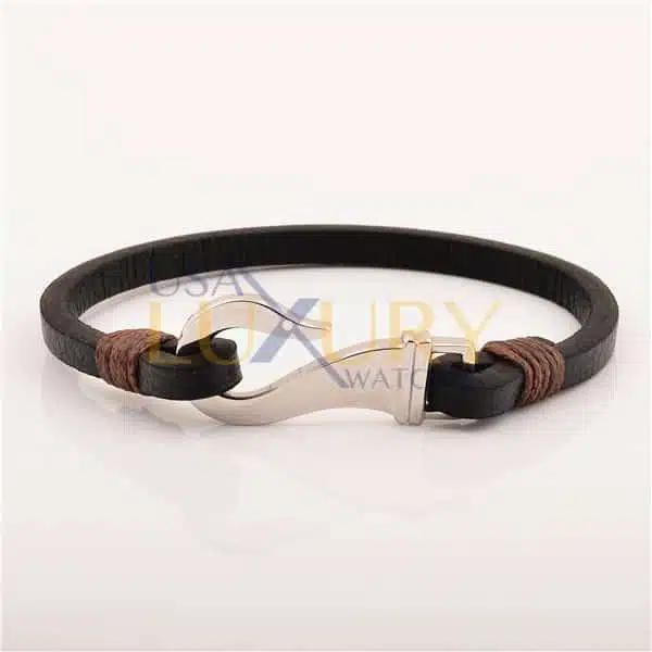 316L Stainless Steel Men Jewelry Fish Hook Real Leather Bracelet Light Black