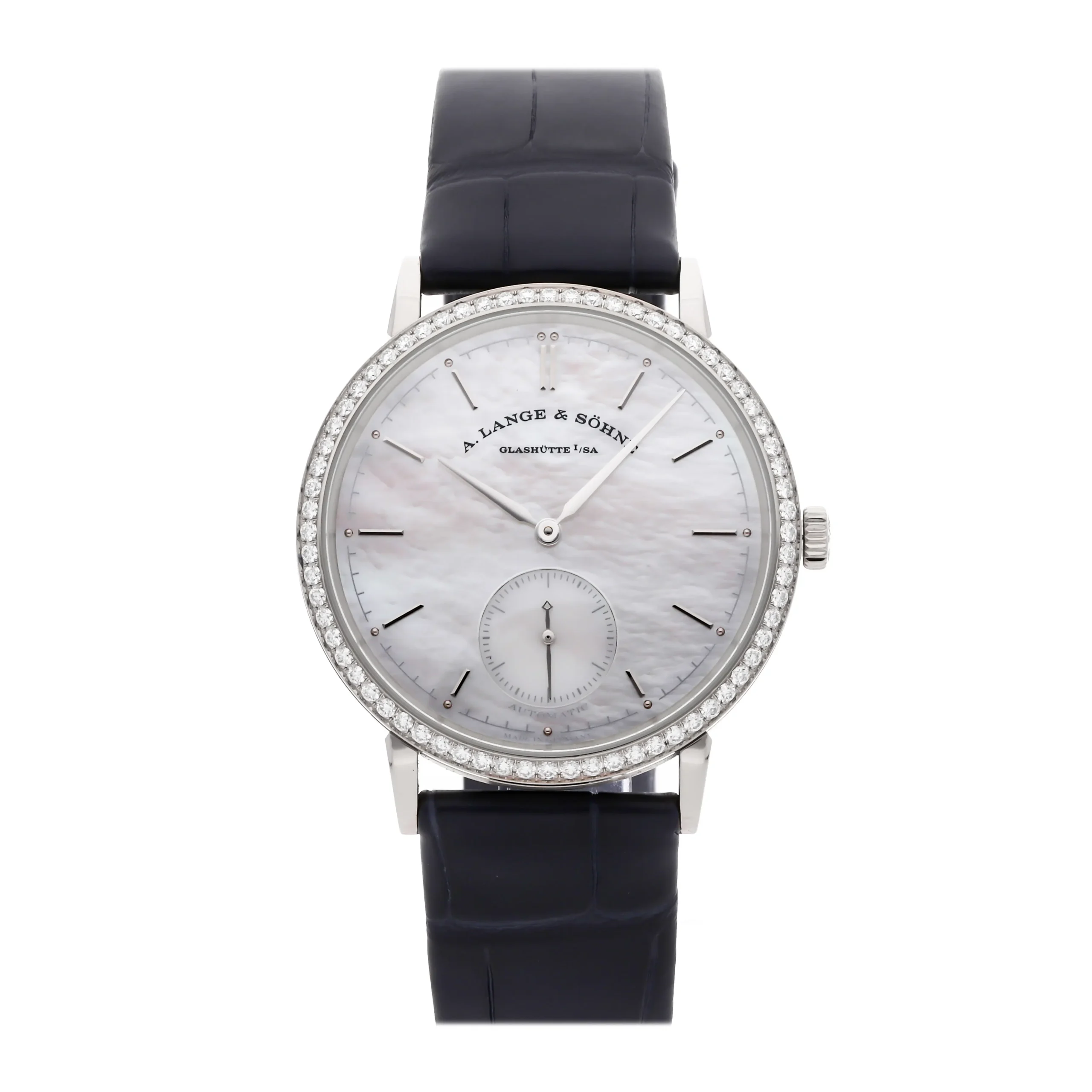 The A. Lange & Söhne Saxonia collection represents the essence of Saxon watchmaking tradition, characterized by pure lines, balanced proportions, and exceptional craftsmanship. This reference 840.029 from 2001 showcases the brand’s commitment to understated elegance with its 37mm white gold case adorned with a diamond bezel, creating a harmonious balance between precious materials and technical precision. The white mother-of-pearl dial captures light beautifully, while the automatic movement visible through the solid caseback demonstrates the meticulous hand-finishing for which A. Lange & Söhne is renowned. The Saxonia’s design philosophy emphasizes clarity and legibility, making it an ideal choice for both daytime professional settings and evening social occasions. The combination of precious materials, sophisticated dial texture, and comfortable blue alligator strap creates a timepiece that transitions seamlessly from boardroom to gala, embodying the timeless elegance that defines German luxury watchmaking at its finest.