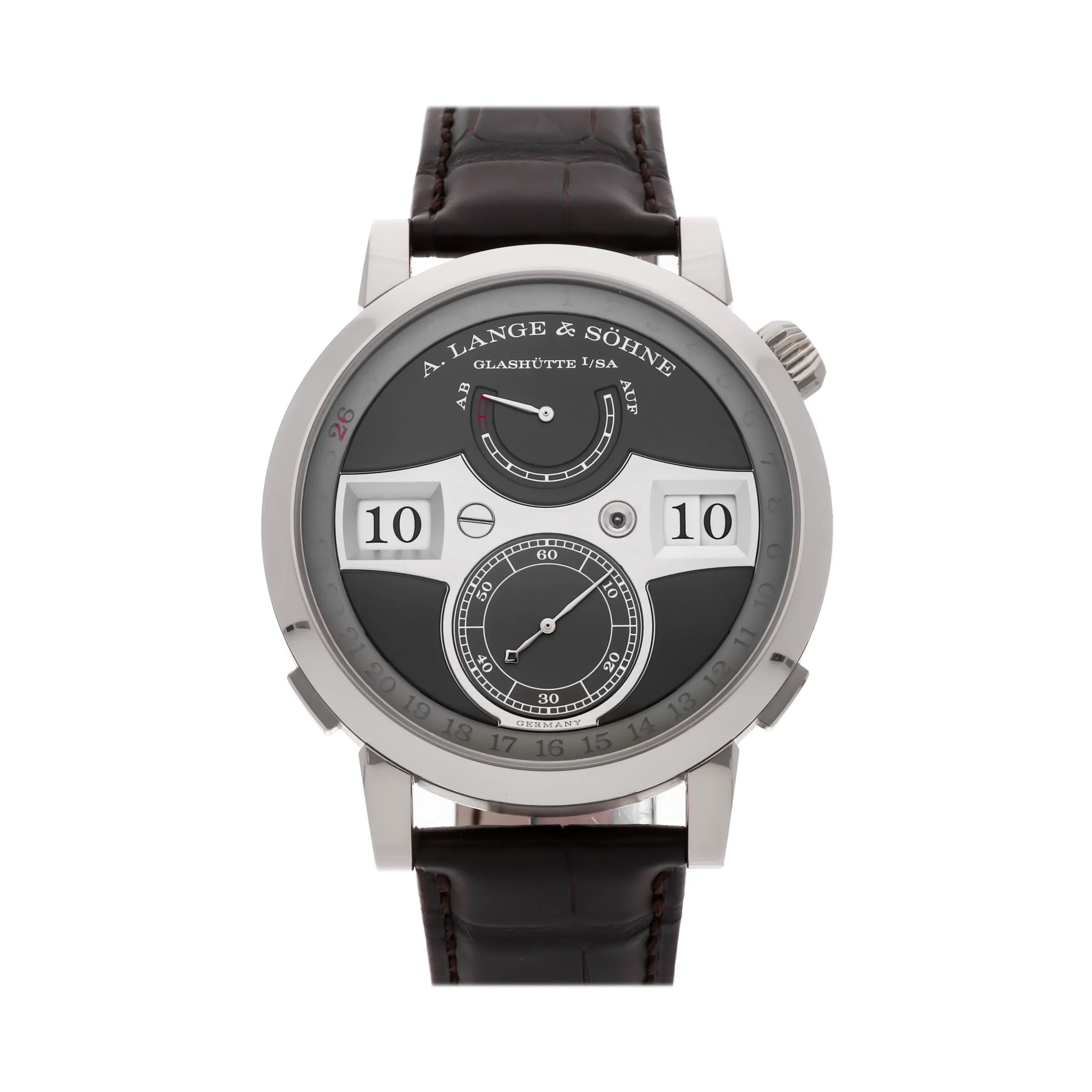 The A. Lange & Söhne Zeitwerk collection represents a revolutionary approach to time display, combining traditional German watchmaking with innovative digital jumping numerals. First introduced in 2009, the Zeitwerk challenged conventional watch design with its unique constant-force mechanism that ensures precise jumps of the hour and minute discs. The Reference 148.038 continues this legacy with its refined 44.2mm white gold case and sophisticated gray dial, where the large digital displays are perfectly balanced by the small seconds subdial and power reserve indicator. Each component reflects the brand’s commitment to hand-finishing, with meticulously decorated movement parts visible through the exhibition caseback. The Zeitwerk’s mechanical complexity makes it ideal for collectors who appreciate both traditional craftsmanship and contemporary design. This timepiece transitions seamlessly from formal occasions to sophisticated business settings, serving as a testament to A. Lange & Söhne’s dedication to mechanical excellence and aesthetic innovation in modern horology.