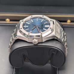 | Dial Material: | “Bleu nuit nuage 50” dial with “Grande Tapisserie” pattern, white gold applied hour-markers and Royal Oak hands with luminescent coating |