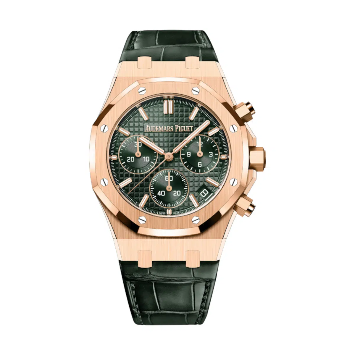 | Dial Material: | Khaki green dial with “Grande Tapisserie” pattern, green counters, pink gold applied hour-markers and Royal Oak hands with luminescent coating |