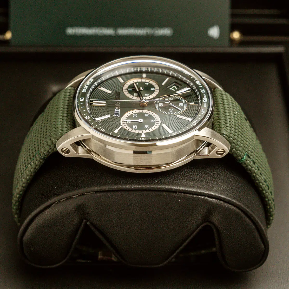 | Dial Material: | Green dial, green counters and rhodium-toned external zone, green counter at 6, white gold hour-markers and hands with luminescent coating, green inner bezel |