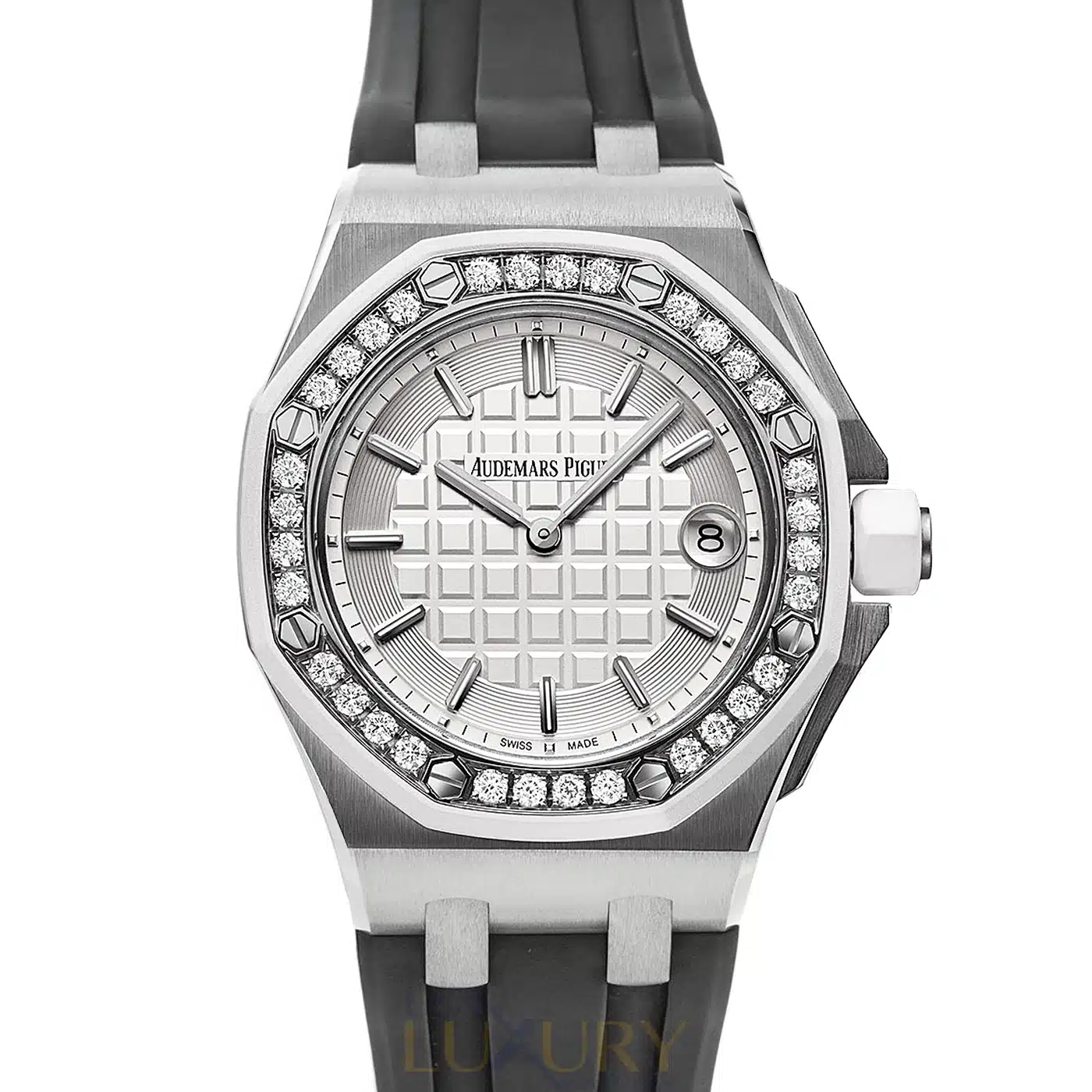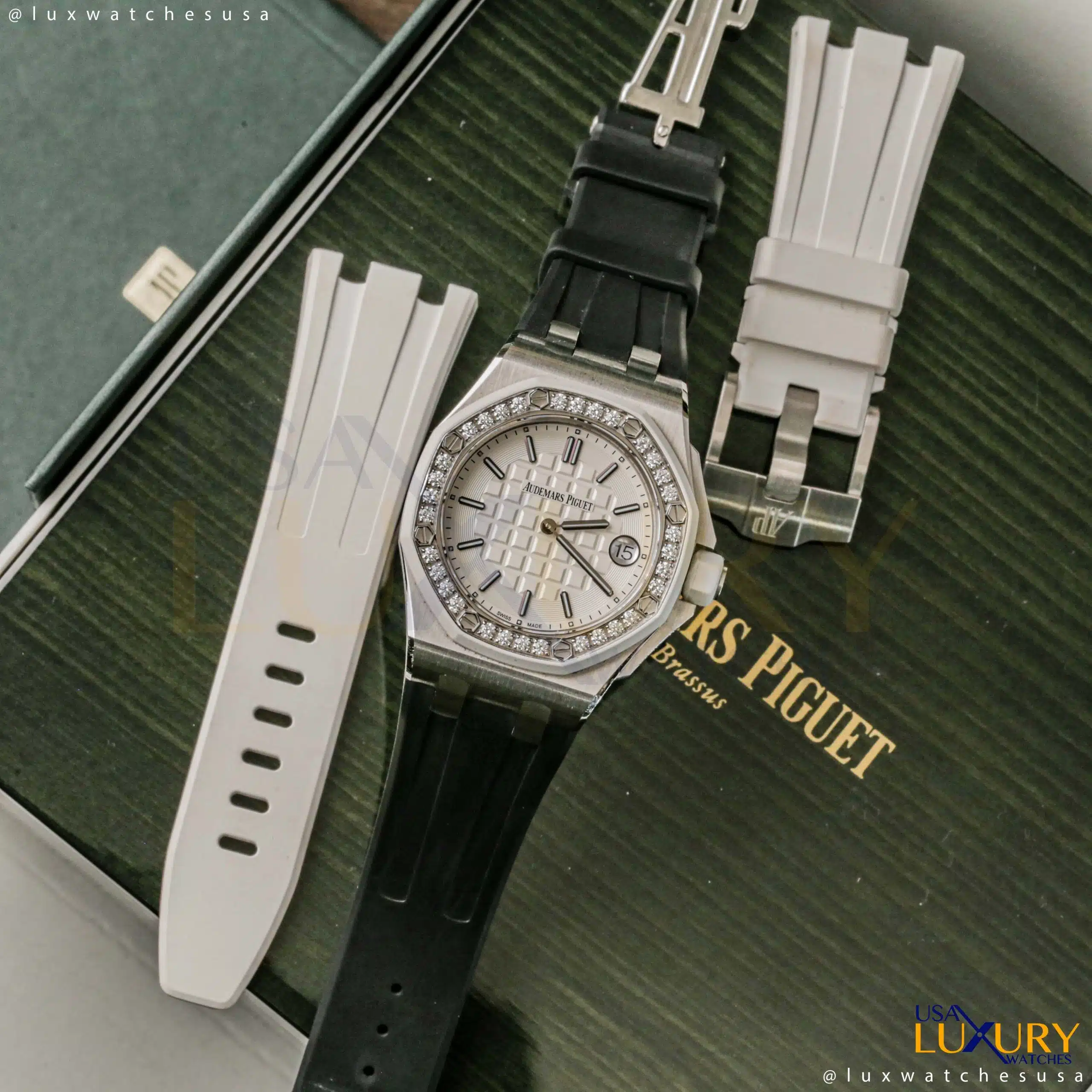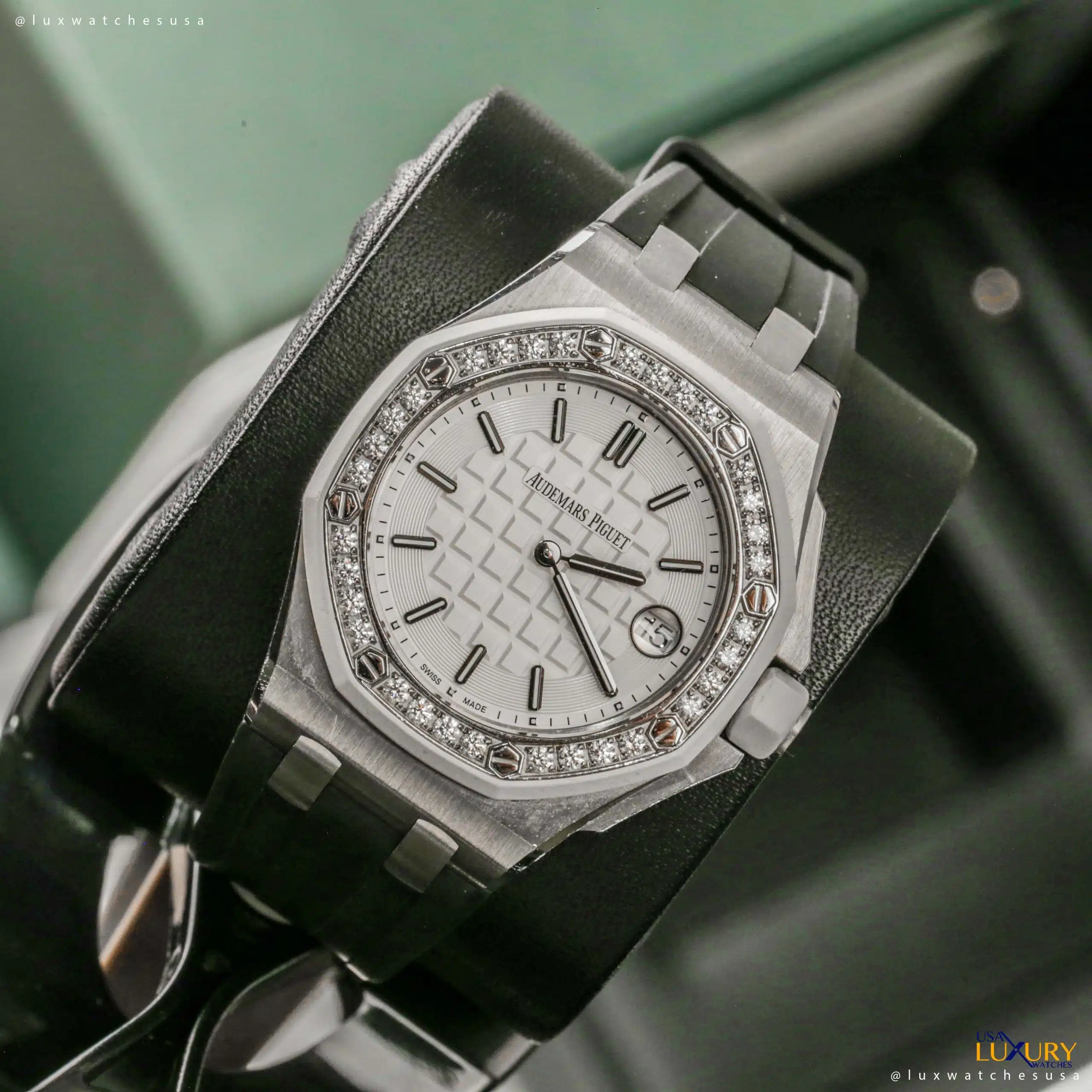 Audemars Piguet 67540SK.ZZ.A010CA.01 Royal Oak Offshore Quartz 37mm White Stick Dial Diamond Bezel Watch