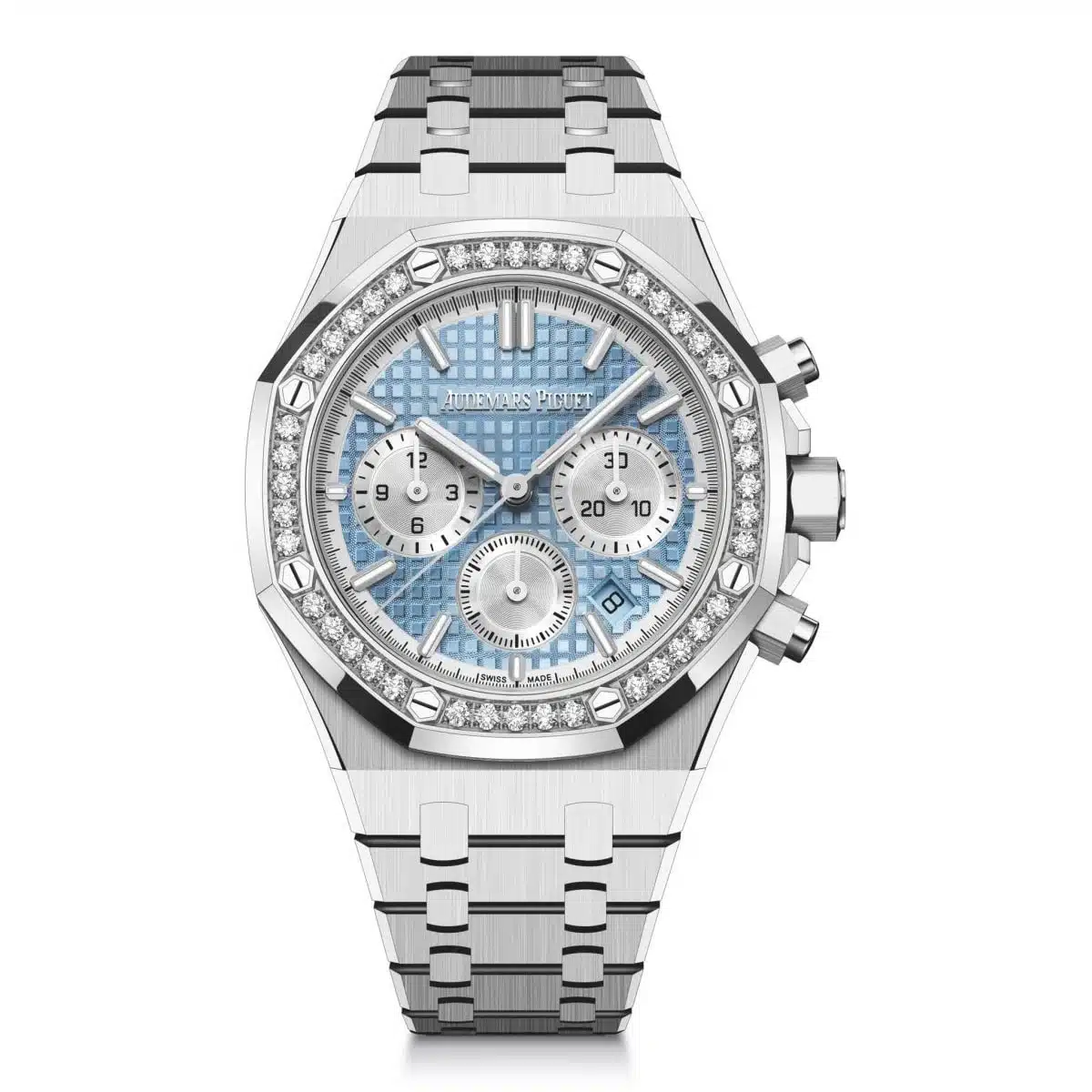 Audemars Piguet Royal Oak Selfwinding Chronograph (ref 26715ST.ZZ.1356ST.01) features an automatic movement; blue tapisserie dial; sapphire-crystal, transparent case back; and 38 mm, stainless steel case on a stainless steel strap with a stainless steel folding clasp.