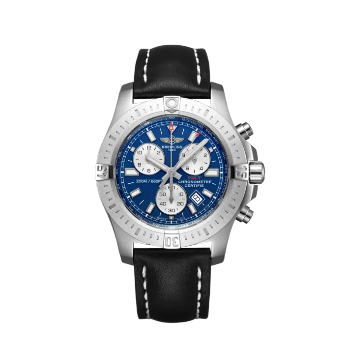 Unworn Watch Breitling Men’s Colt Chronograph Stainless steel case with a polished finish. Mariner Blue dial with a very fine concentric circle pattern texture. Stepped-down silver sub-dials with thin polished steel rims & with a fine concentric circle pattern texture. Applied polished steel-rimmed index hour markers with luminous fill.